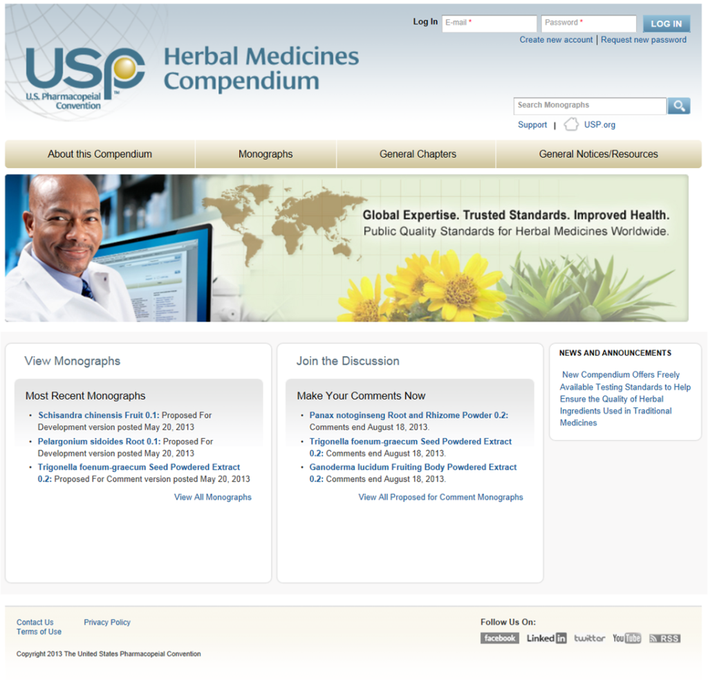미국약전 (United States Pharmacopeial Convention, USP) 에서는 아래와 같이 새로운 compendium Herbal Medicines Compendium 론칭 하였음을 알려 드립니다.
