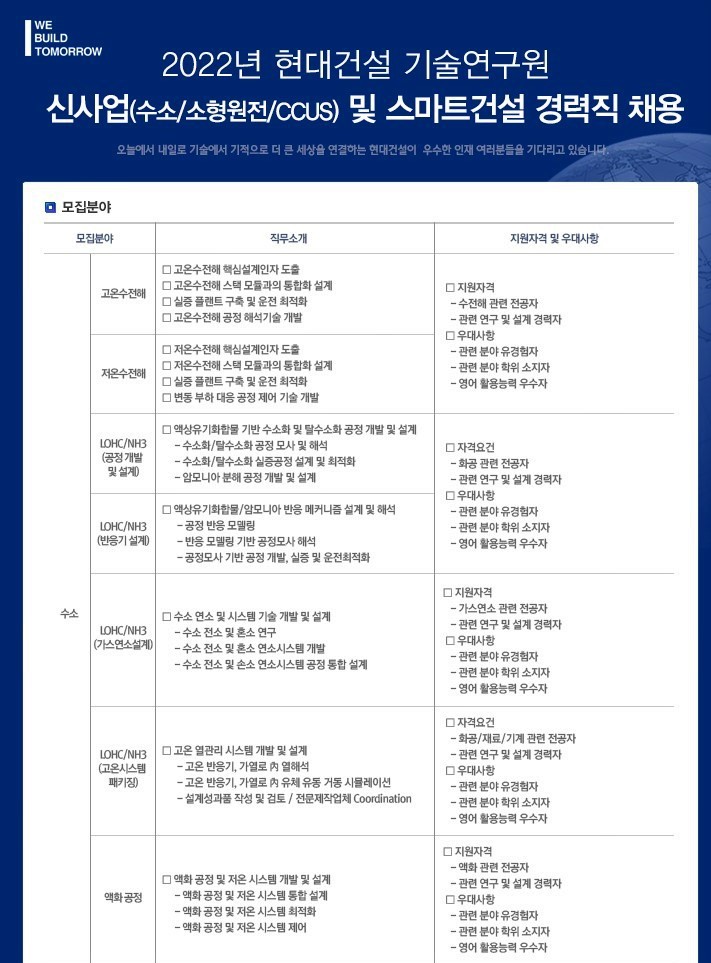 현대건설에서는 수소(수전해, LOHC, 암모니아, 액화) 관련 연구 및 설계 경력자 채용을 위해 「기술연구원 신사업(수소) 경력직 채용」을 시행하고 있습니다.