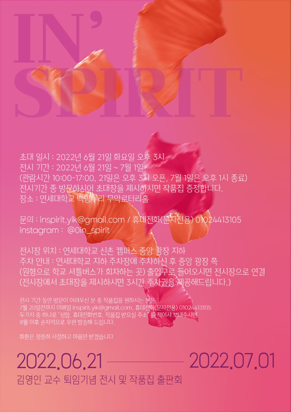 수많은 업적에도 불구하고 자신을 드러내는데 소홀하셨던 김영인 교수님의 작품들을 모아 책으로 기록하면서 책에만 담기 아쉬운 작품들을 전시회를 통해 한 번 더 보여드리게 되었습니다. 이번 작품집과 전시는 은사님의 은퇴를 아쉬워하는 제자들의 마음이 모여 이루어졌습니다. 아울러 김영인 교수님 내외분은 이 뜻깊은 전시의 시작을 함께 학계를 이끌어 오신 분들과 나누고 싶어 하십니다. 바쁘신 가운데 잠시 시간을 내시어 초대에 참석해주시길 정중히 요청드립니다. 오프닝 행사에 참석하실 분들을 위해 작품집과 함께 약소한 선물도 준비했사오니 부디 참석하시어 받아 주시길 바랍니다. 감사합니다.