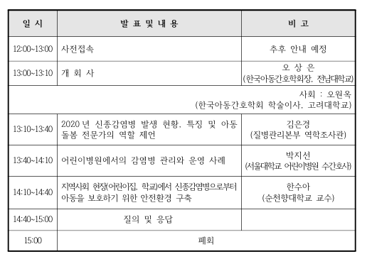 한국아동간호학회에서는 COVID-19 신종감염병 상황과 관련하여, 2020년 하계학술대회를 온라인상에서 Web Seminar 형태로 다음과 같이 개최합니다. 관심있는 분들의 많은 참석 바랍니다.