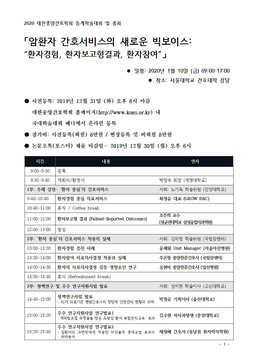대한종양간호학회에서는 2020년도 동게학술대회 및 총회를 아래와 같이 개최합니다.