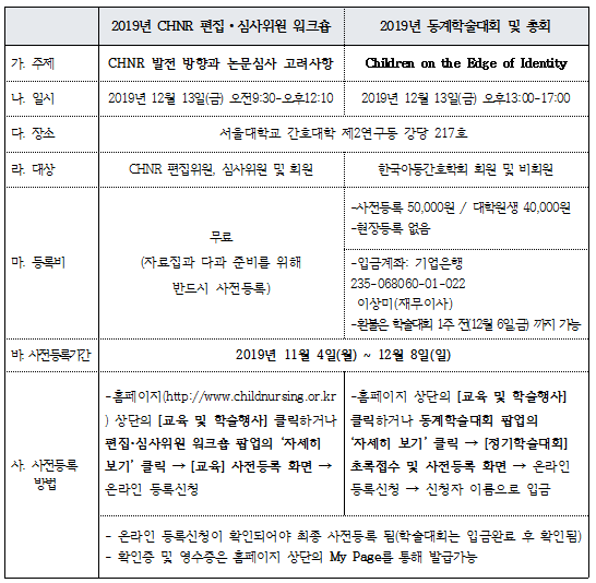 2019년 한국아동간호학회 CHNR편집심사위원 워크숍, 동계학술대회 및 총회 안내