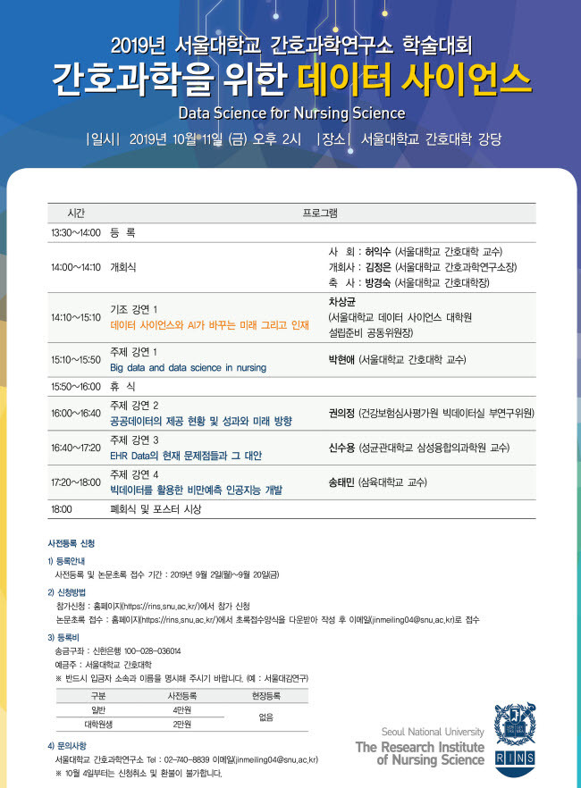 서울대학교 간호과학연구소에서는 2019년 10월 11일(금) 오후 2시부터 오후 6시까지