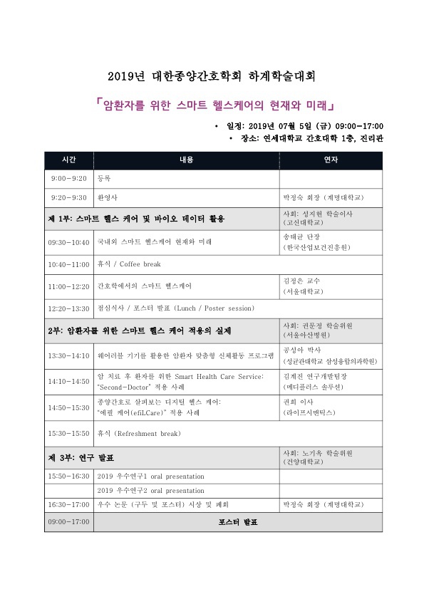 대한종양간호학회의 2019년 하계 학술대회를 아래와 같이 안내드립니다.