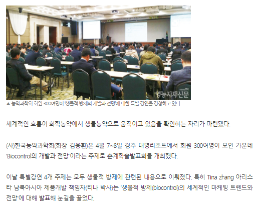 [전체공지][한국농약과학회 춘계학술발표회]생물농약, 세계적 대세로 부각