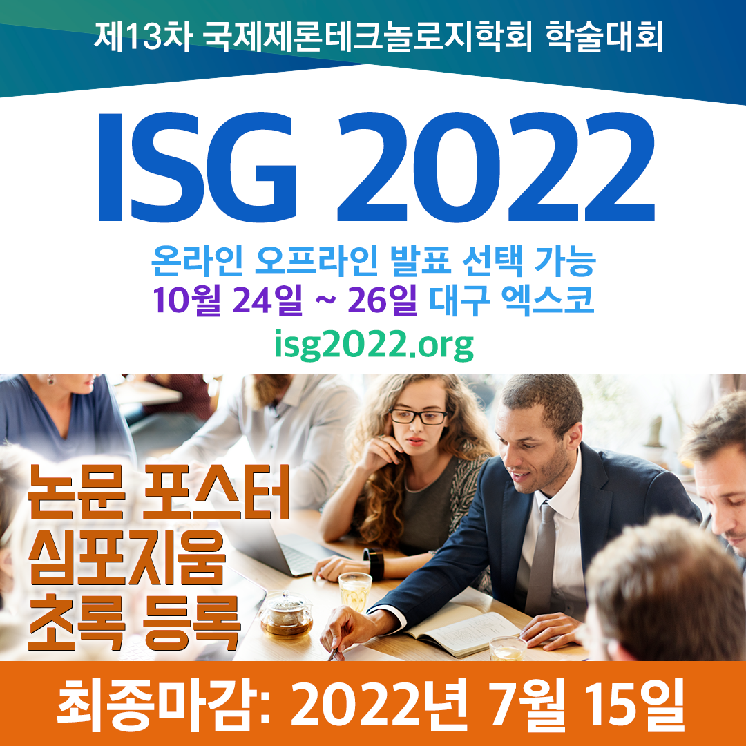 - 13차 국제제론테크놀로지 세계대회(ISG 2022) 논문(구두/포스터) 초록 접수 연장 (~7/15까지) 안내 -