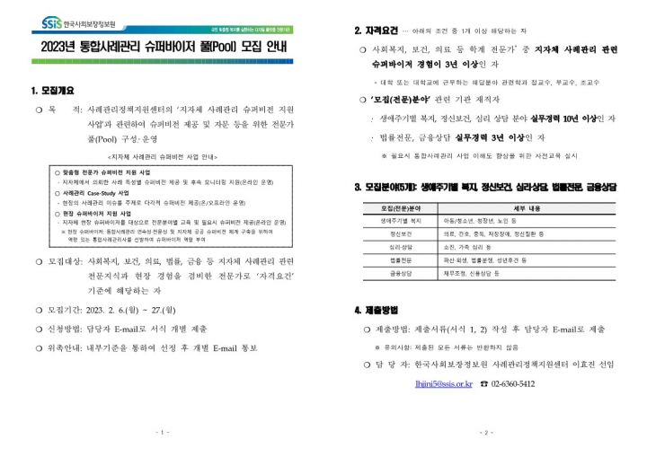 아래와 같이 2023년 통합사례관리 슈퍼바이저 풀(pool) 모집 안내 전달드립니다.