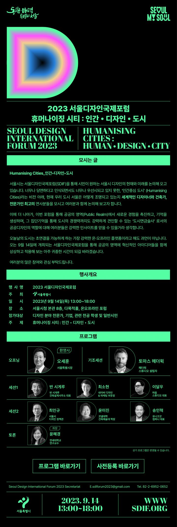 패널: 토마스 헤더윅(헤더윅 스튜디오 설립자), 반 시게루(반 시게루 건축사무소 대표), 윤미진(코넬대학 건축예술대 학장), 최인규(서울특별시 디자인정책담당관), 최소현(네이버 디자인&마케팅 부문장), 송인혁(유니크굿컴퍼니 대표), 이달우(마음스튜디오 대표)