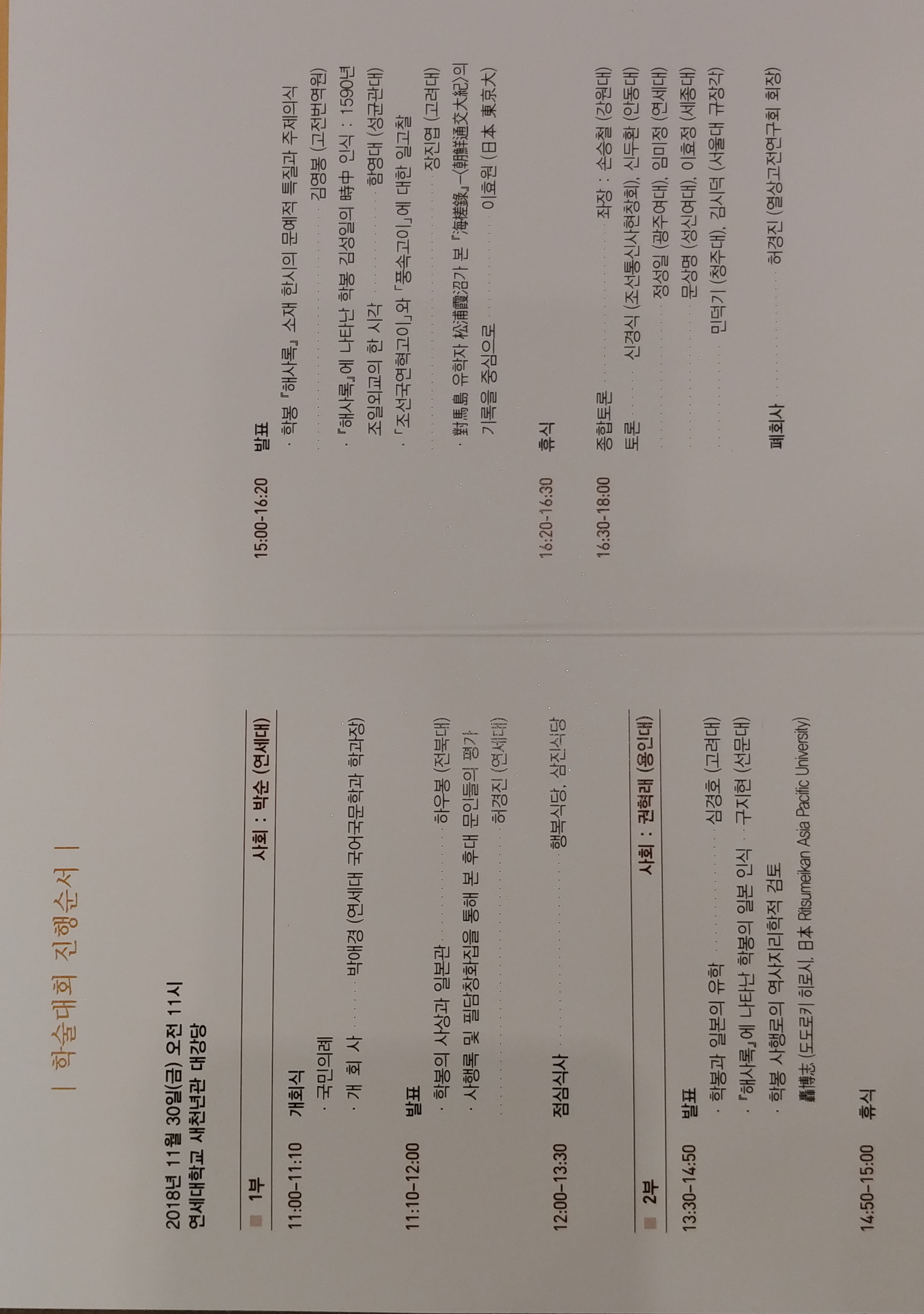 학봉 해사록 재조명 학술회의, 11월 30일, 연세대학교