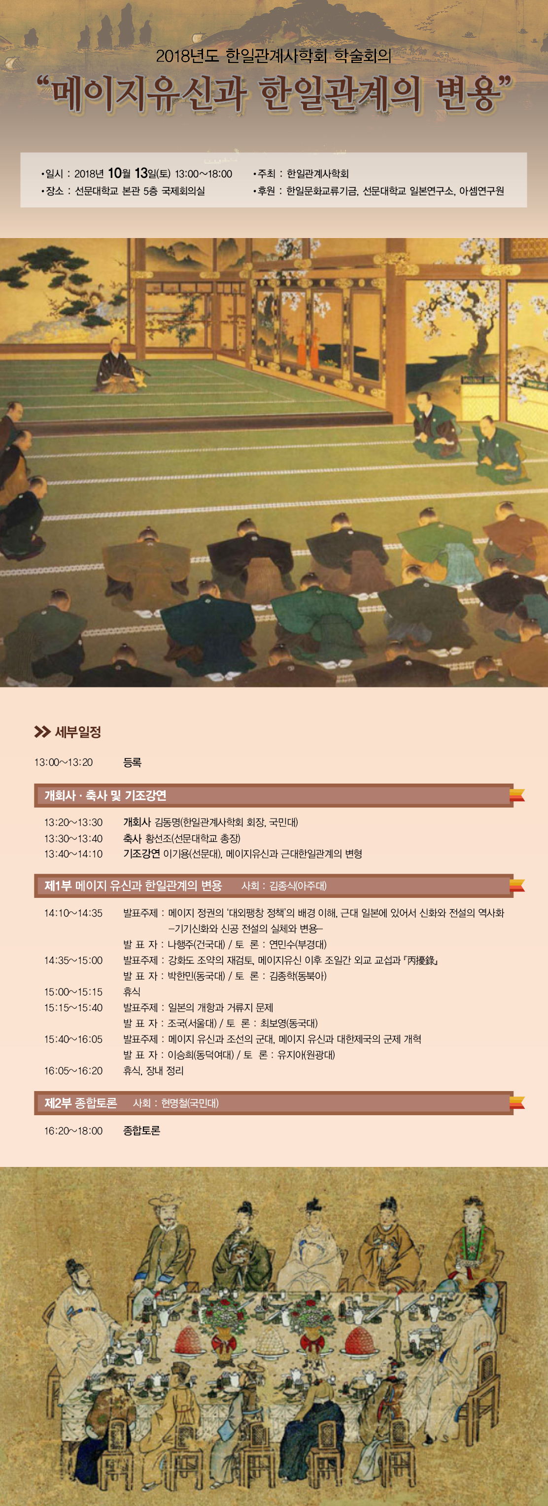 올해 2018년은 일본에서 메이지(明治) 정권이 수립된 지 150주년이 되는 해입니다. 주지하는 바와 같이 메이지유신은 근대 일본의 출발점으로 전근대 질서와는 전혀 다른 패러다임의 한일관계의 시작점이기도 합니다. 메이지유신 이후 일어난 일본의 제도와 사회의 변화가 한반도에 어떠한 영향을 끼치고, 그로 인해 한일관계는 어떻게 전환되었는지에 대해 고찰하는 것은 근대 이후 구축된 한일관계의 계보를 분석하는 데 매우 필요한 작업이라고 생각합니다. 이에 본 학회는 메이지유신 이후 변용된 한일관계를 통해 바뀌어가는 한국의 사회상을 다각적으로 다루기 위해 「메이지유신과 한일관계의 변용」이라는 주제를 가지고 학술회의를 개최하게 되었습니다. 구체적으로는 메이지정권의 대외팽창 정책의 배경으로서 근대 일본에서 신화와 전설이 역사화하는 과정, 메이지유신 이후의 조일 간 외교 교섭의 변화, 개항 이후의 거류지 문제, 메이지유신과 대한제국의 군제 개혁 등을 분석했습니다. 특히 이번 학술회의는 우리 학회 창립 초기부터 학회 발전을 위해 열정을 쏟으신 이기용 교수님이 재직하신 선문대학교에서 열립니다. 지난 학기에 정년을 맞이하신 이교수님의 그 동안의 노고에 깊이 감사드립니다. 공사다망하시리라 믿습니다만 유서 깊은 아산에 오셔서 천고마비의 계절을 만끽하시고 자리를 빛내주시면 고맙겠습니다. 각별히 본 학술회의를 후원해주신 한일문화교류기금과 아셈연구원, 그리고 학회장소를 마련해주신 선문대학교 일본학연구소에 깊은 감사를 올립니다.