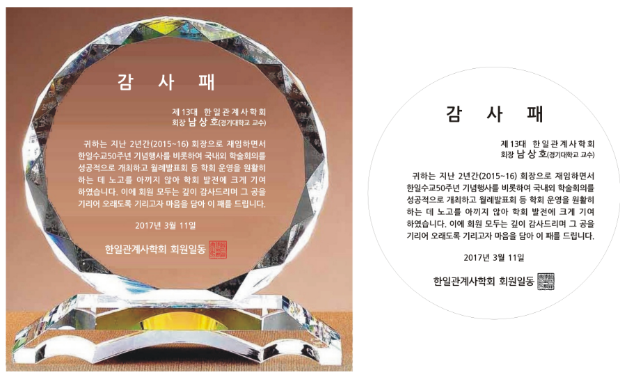 뒤늦게 게시합니다. 2015년 9월에 한일수교50주년을 기념하여 상호이해와 협력을 위한 역사적 재검토 5개국 학술회의를 개최한 공로가 상패에 표기되었습니다.