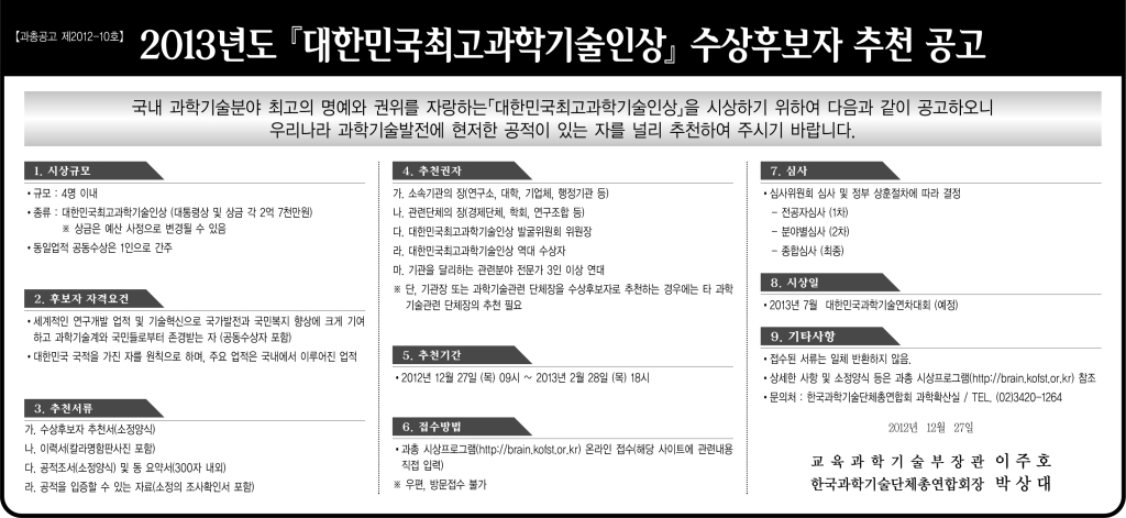 2. 2013년도『대한민국최고과학기술인상』수상후보자 추천공고 1부. 끝. |