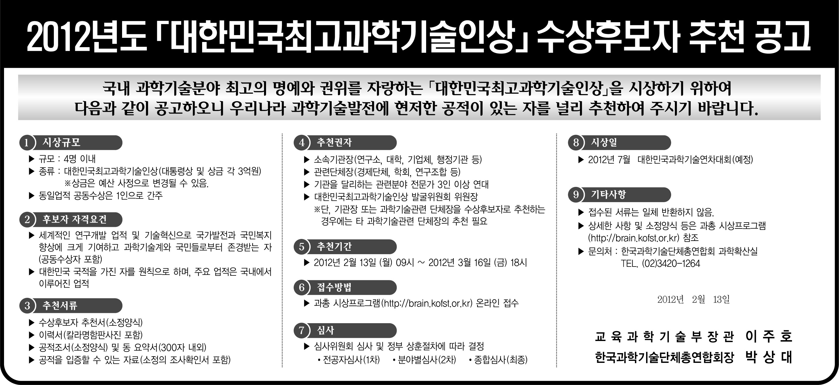 첨 부: 2012년도 “대한민국최고과학기술인상” 수상후보자 추천공고 1부. 끝.