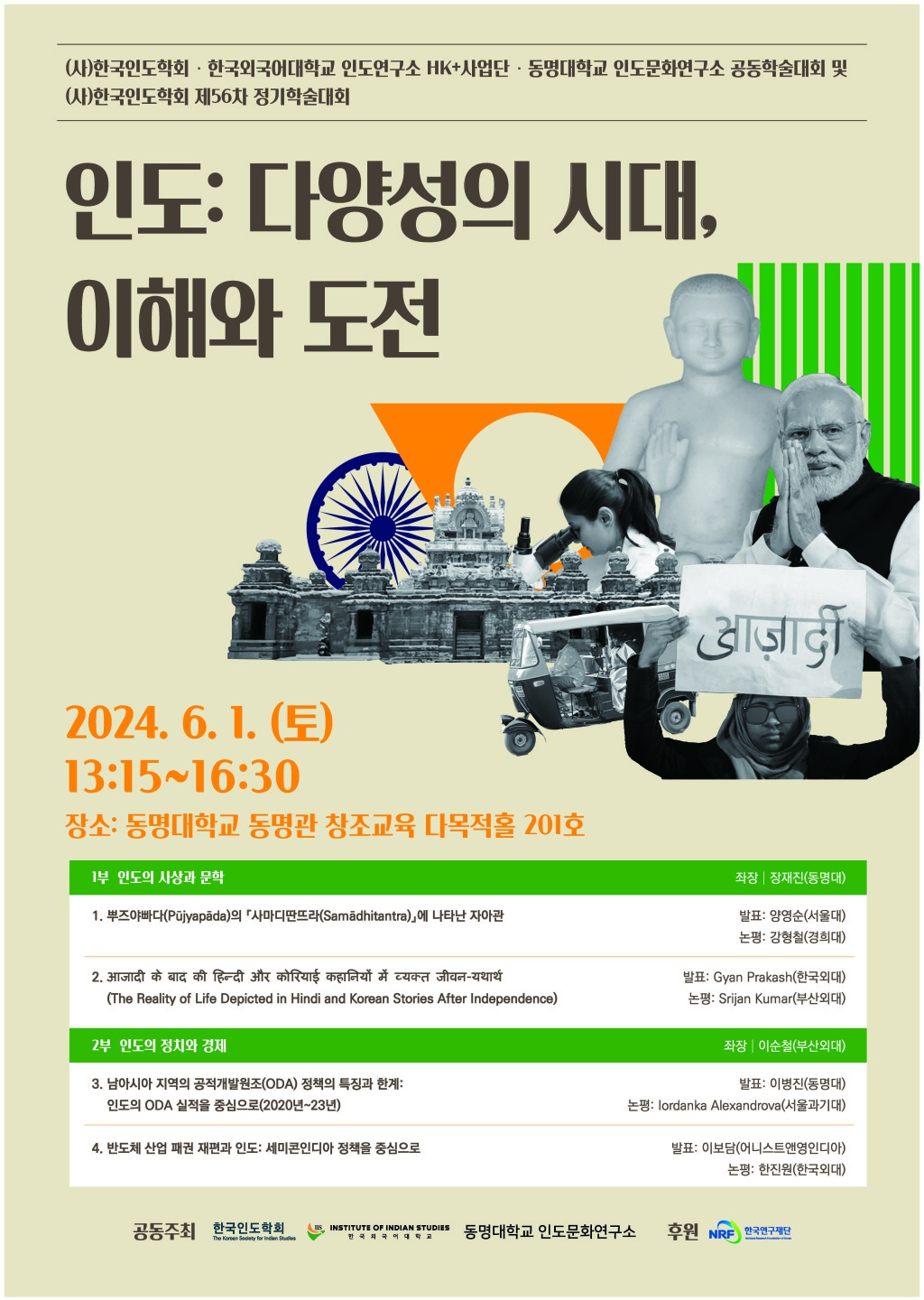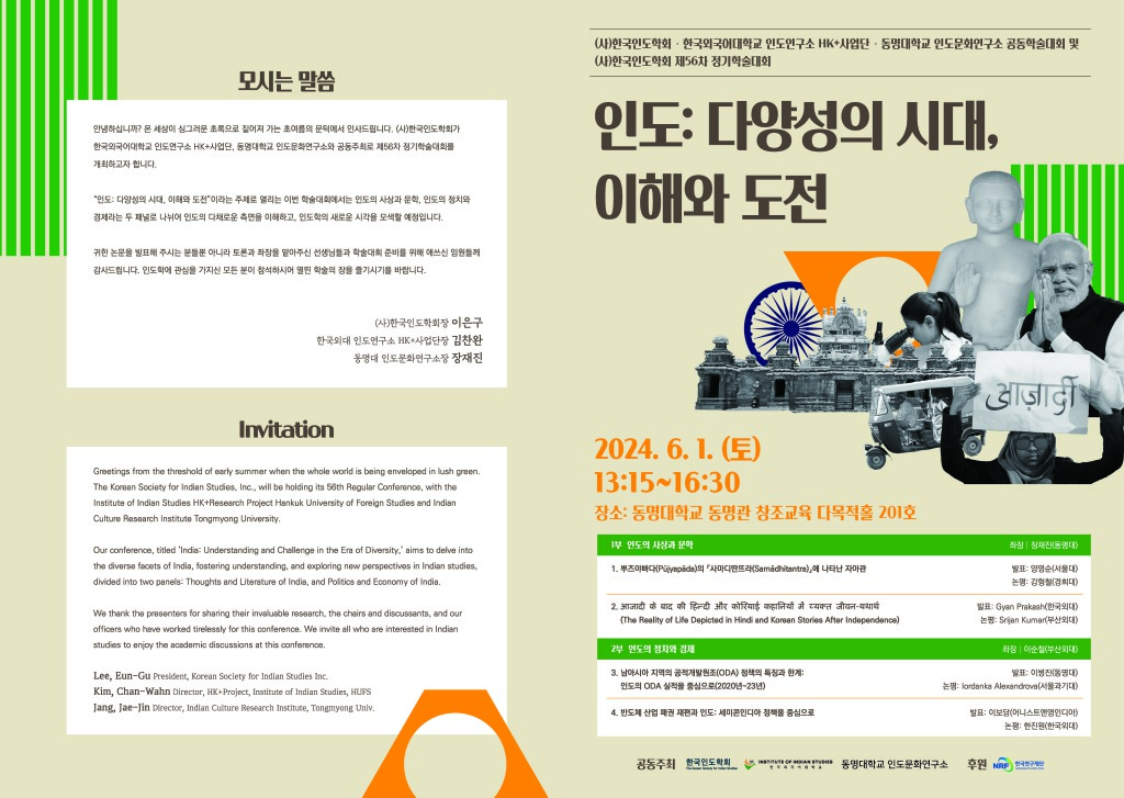 안녕하십니까? 온 세상이 싱그러운 초록으로 짙어져 가는 초여름의 문턱에서 인사드립니다. (사)한국인도학회가 한국외국어대학교 인도연구소 HK+사업단, 동명대학교 인도문화연구소와 공동주최로 제56차 정기학술대회를 개최하고자 합니다.