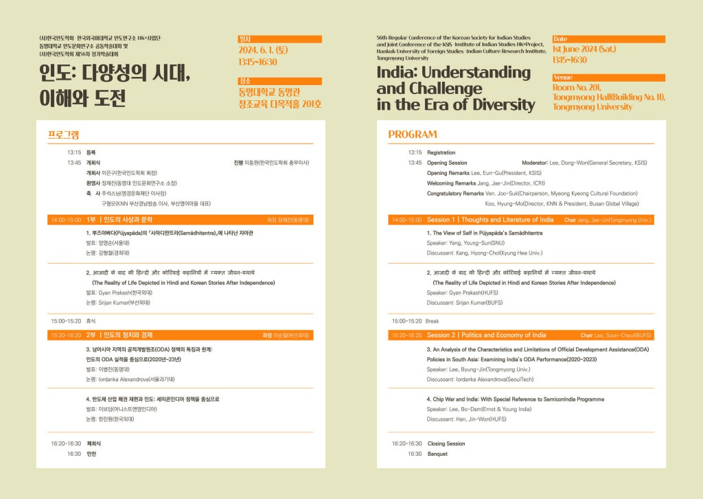 Greetings from the threshold of early summer when the whole world is being enveloped in lush green. The Korean Society for Indian Studies, Inc., will be holding its 56th Regular Conference, with the Institute of Indian Studies HK+Research Project Hankuk University of Foreign Studies and Indian Culture Research Institute Tongmyong University.