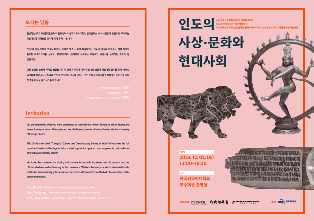 안녕하십니까? (사)한국인도학회·인도철학회·한국외국어대학교 인도연구소 HK+사업단이 공동으로 주최하는 학술대회에 여러분을 모시게 되어 무척 기쁩니다.