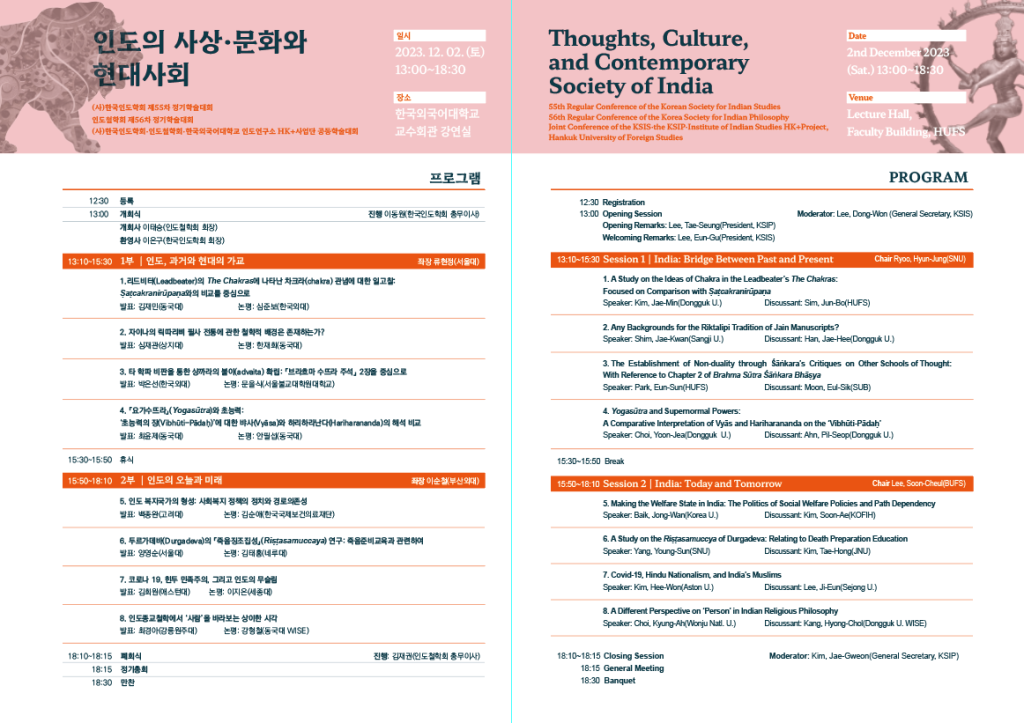 귀한 논문을 발표해 주시는 분들뿐 아니라 토론과 좌장을 맡아주신 선생님들과 학술대회 준비를 위해 애쓰신 임원들께 항상 감사드립니다. 인도와 인도학에 관심을 가지신 모든 분이 참석하시어 협력적 탐구의 온기로 가득 찬 학술의 장을 즐기시기를 바랍니다.