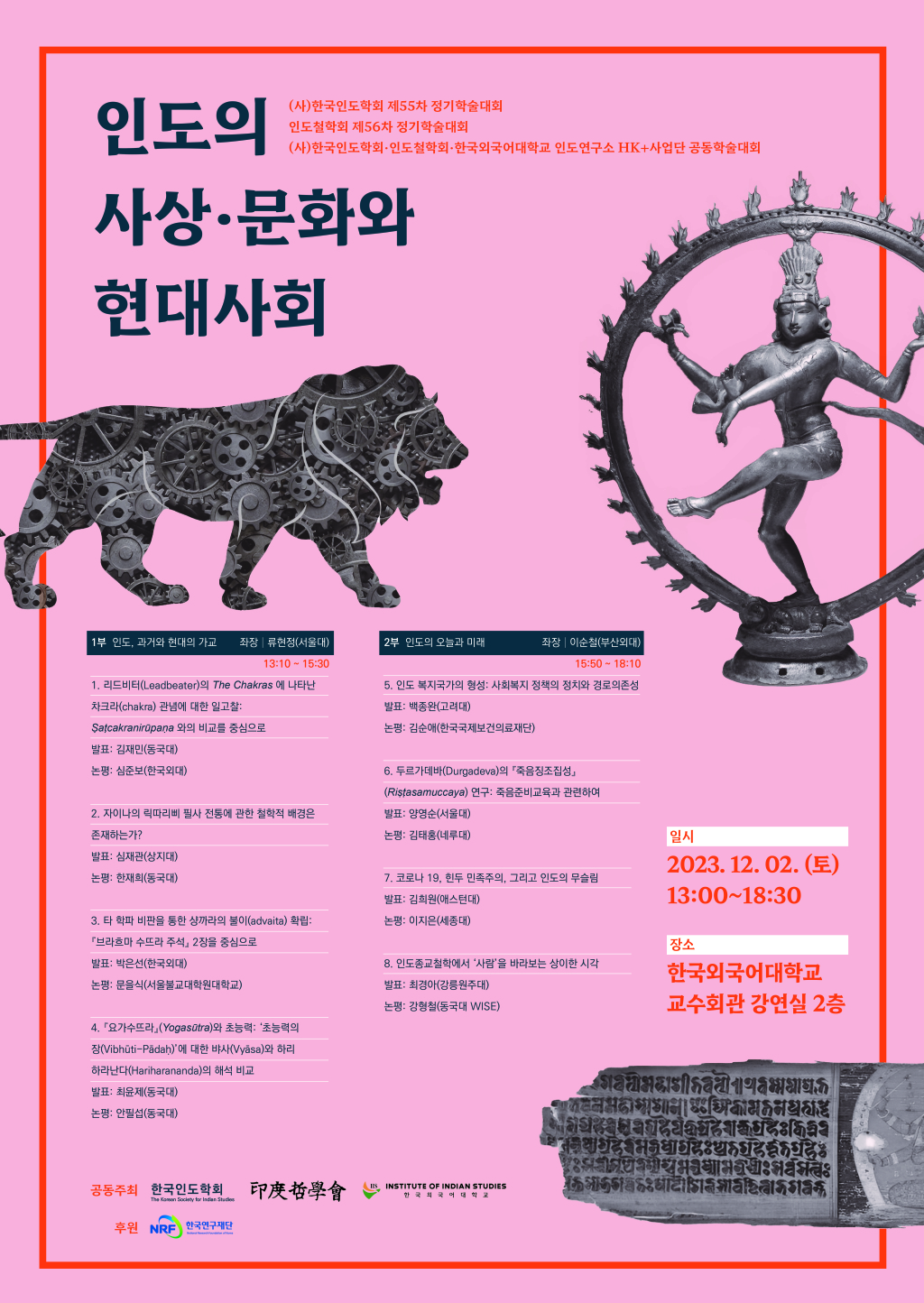 “인도의 사상·문화와 현대사회”라는 주제로 열리는 이번 학술대회는 인도의 사상과 문화라는 지적 유산의 풍부한 태피스트리를 살피고, 현대사회와의 관계에서 보여주는 역동적인 뉘앙스를 논의하는 자리가 될 것입니다.