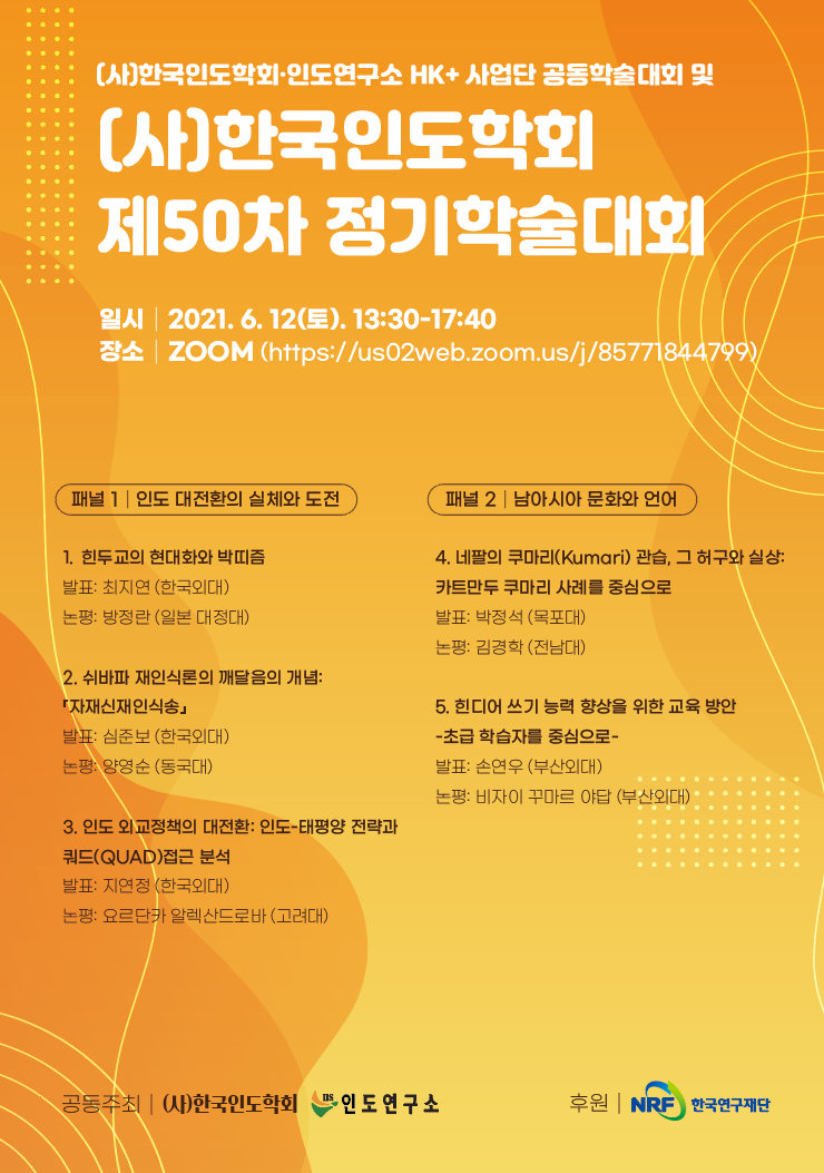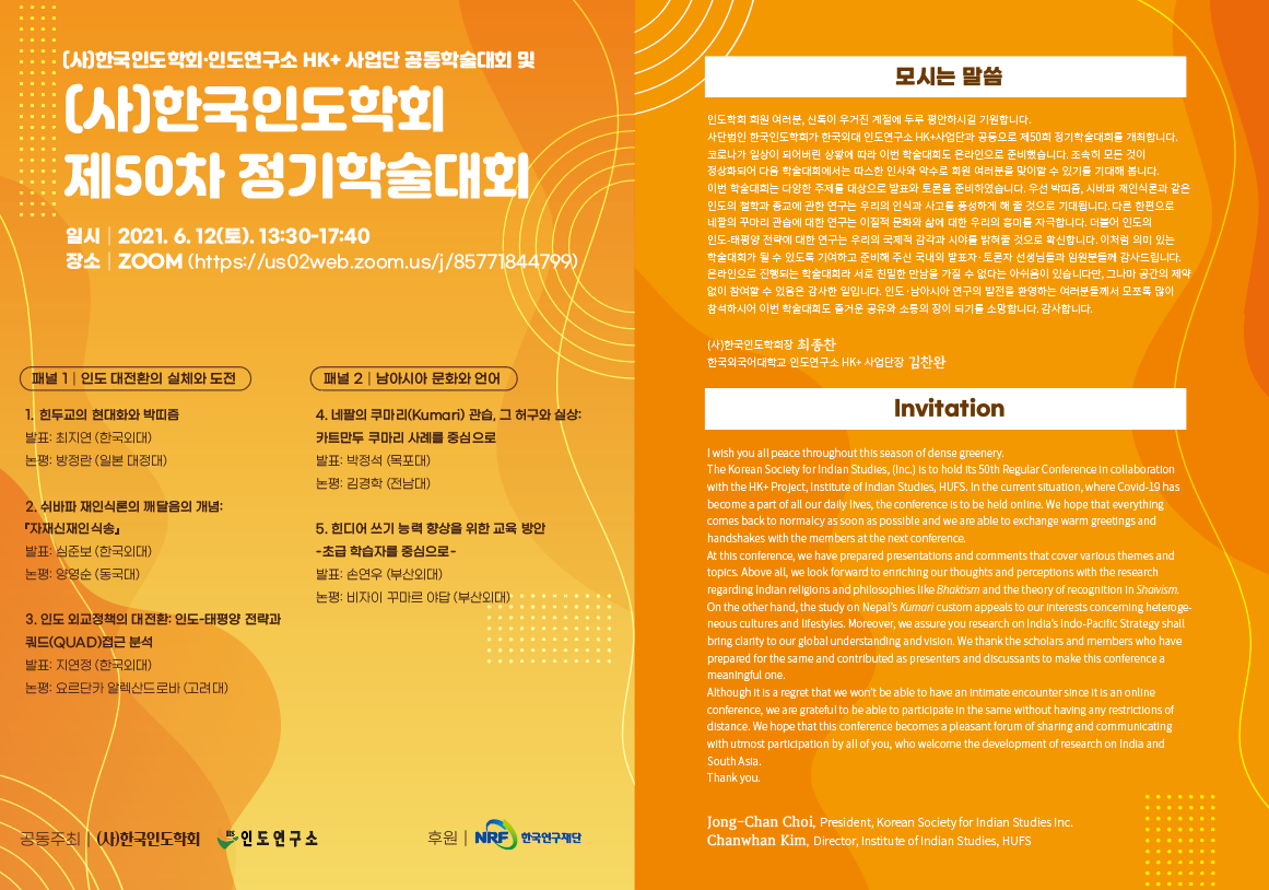 사단법인 한국인도학회가 한국외대 인도연구소 HK+사업단과 공동으로 제50회 정기학술대회를 개최합니다. 코로나가 일상이 되어버린 상황에 따라 이번 학술대회도 온라인으로 준비했습니다, 조속히 모든 것이 정상화되어 다음 학술대회에서는 따스한 인사와 악수로 회원 여러분을 맞이할 수 있기를 기대해 봅니다.