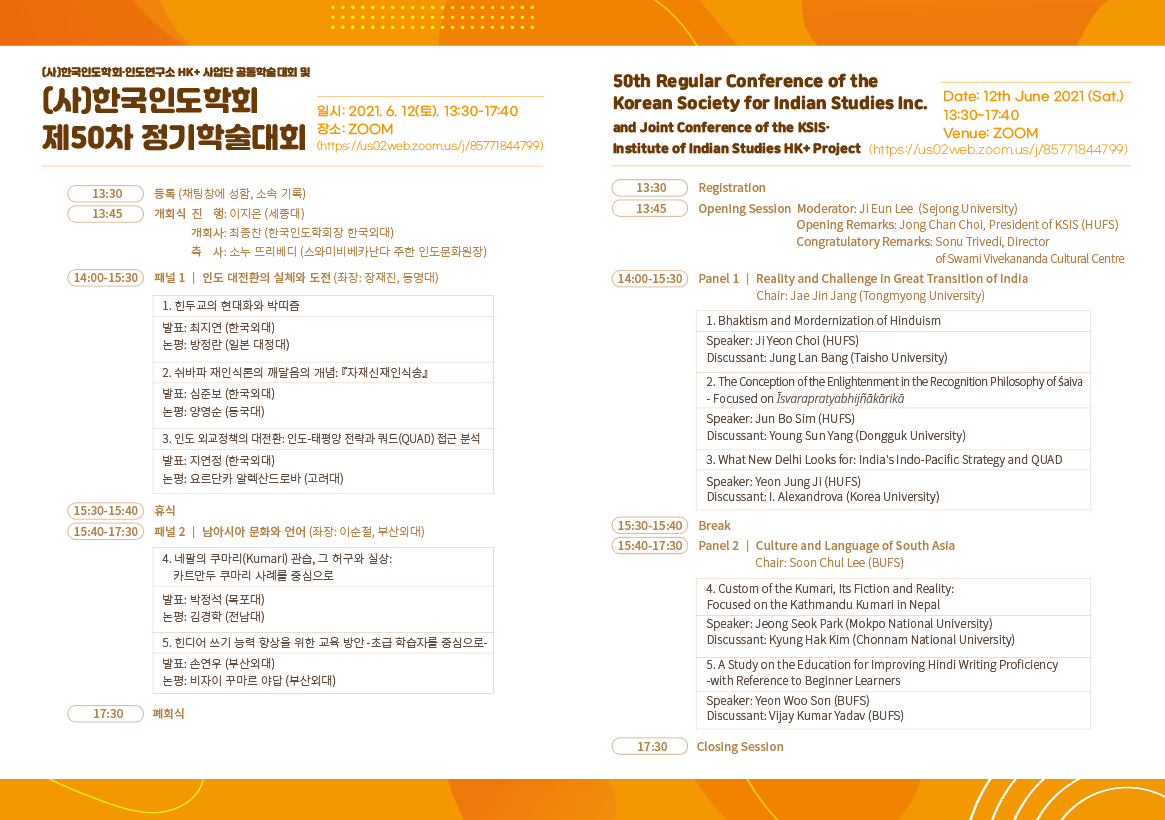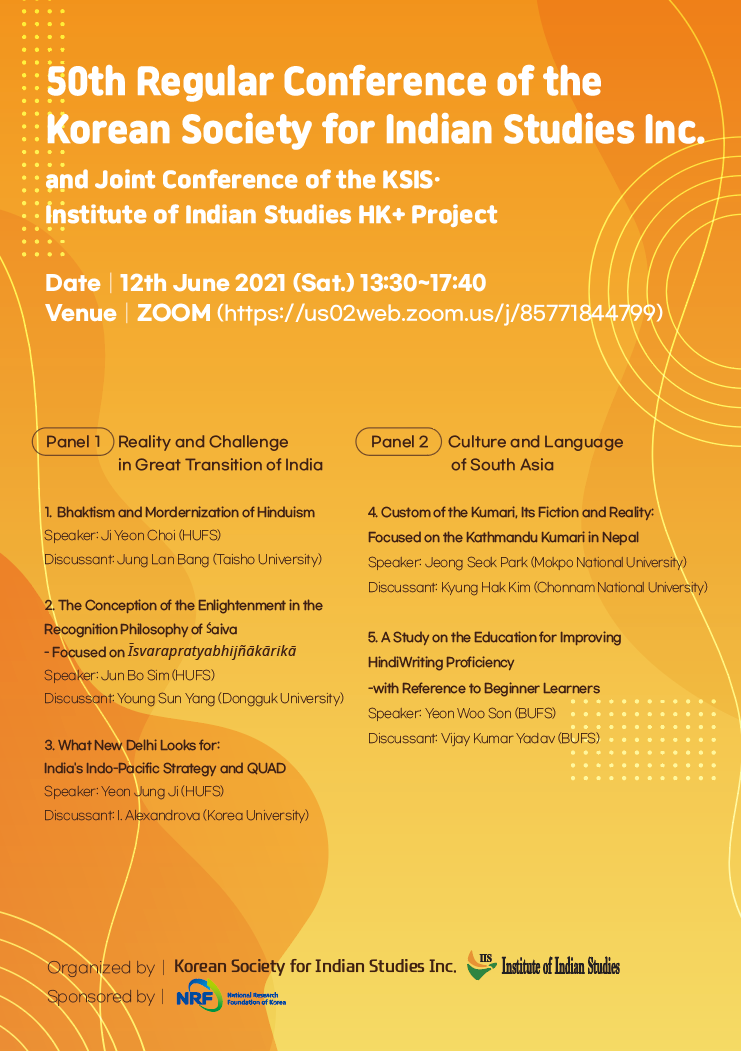 The Korean Society for Indian Studies, Inc. is to hold its 50th Regular Conference in collaboration with the HK+ Project, Institute of Indian Studies, HUFS. In the current situation, where Covid-19 has become a part of all our daily lives, the conference is to be held online. We hope that everything comes back to normalcy as soon as possible and we are able to exchange warm greetings and handshakes with the members at the next conference.