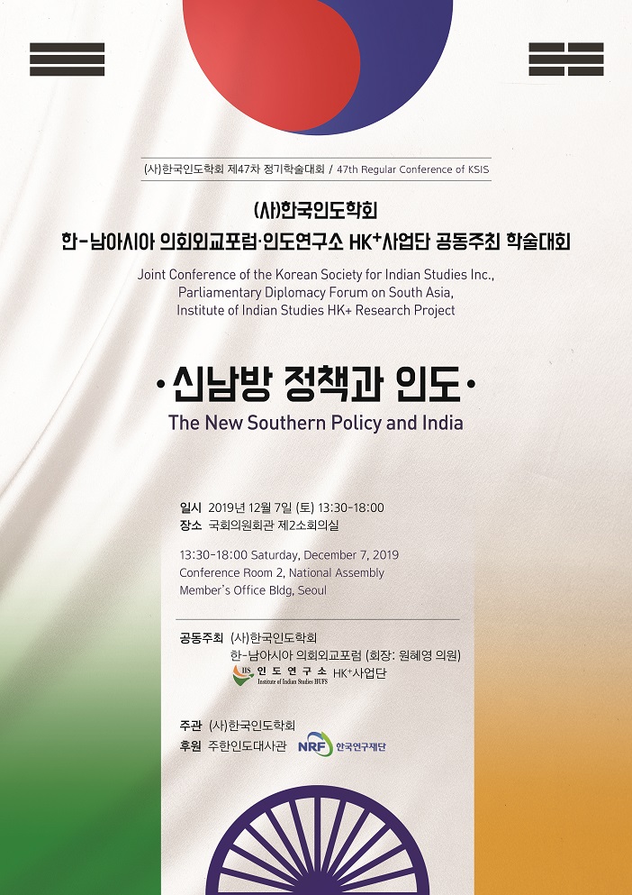 The Korean Society for Indian Studies Inc will hold its 47th Regular Conference, co-hosted by the Parliamentary Diplomacy Forum on South Asia (President: Mr. Hye-young Won) and the HK+ Project, Institute of Indian Studies, Hankuk University of Foreign Studies. This Conference, titled 'The New Southern Policy and India' will examine the policies related with India following the 2017 announcement focusing on strengthening relationships with South and Southeast Asian nations. Particularly, we will be discussing how the key concepts of People, Peace, Prosperity will relate to the foreign policies, economics, society and culture of India and surrounding nations. The Indian Embassy in Seoul, as well as the Presidential Committee on New Southern Policy will be presenting their policies and forecasts, and we look forward to various voices from economics, society, and culture to be represented in the discussion. We thank the officers and members of our society, and invite all who are interested in India and Indology to join us at the event.