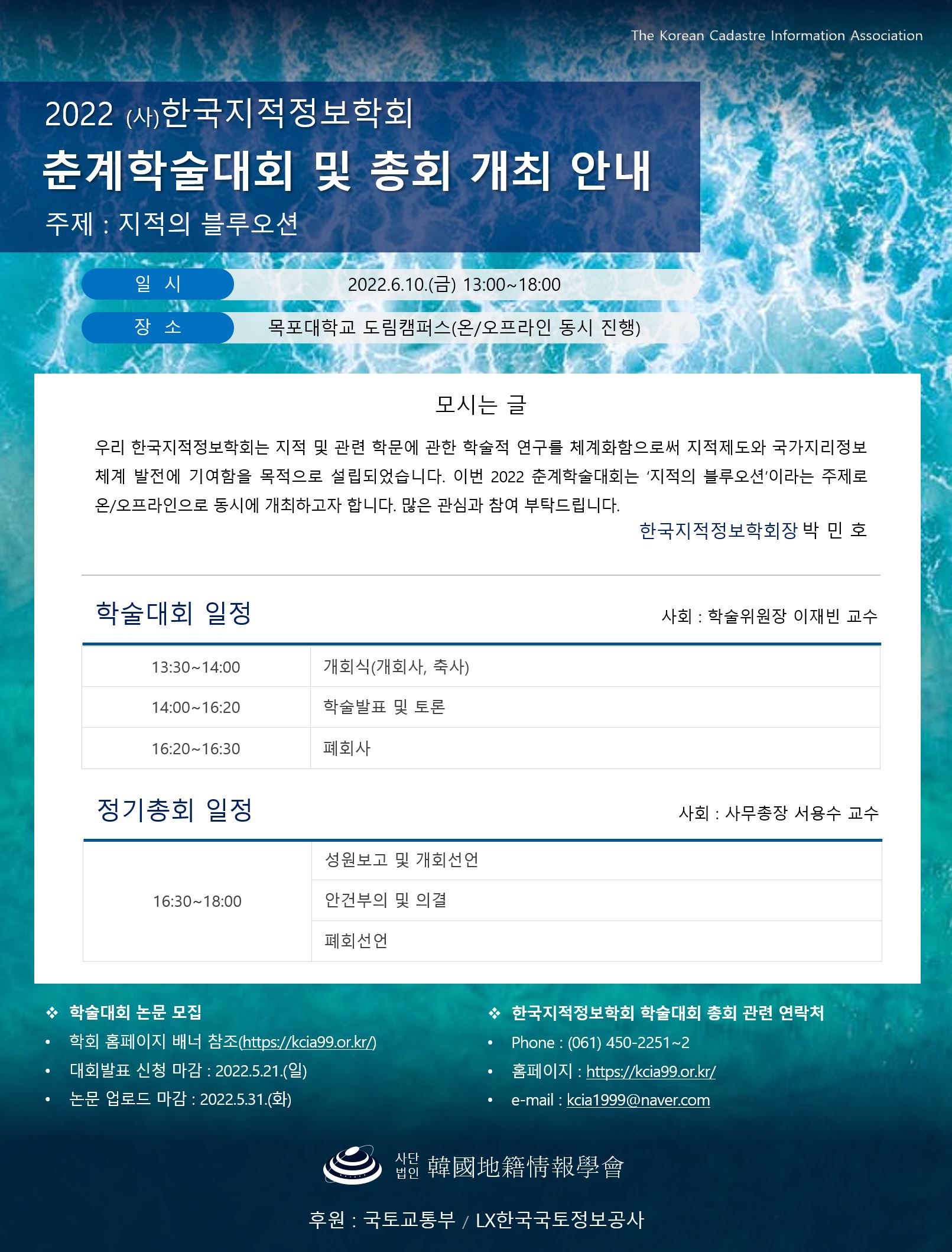우리 한국지적정보학회는 지적의 블루오션을 주제로 2022년 춘계학술대회를 [온/오프라인]으로 개최하고자 합니다.