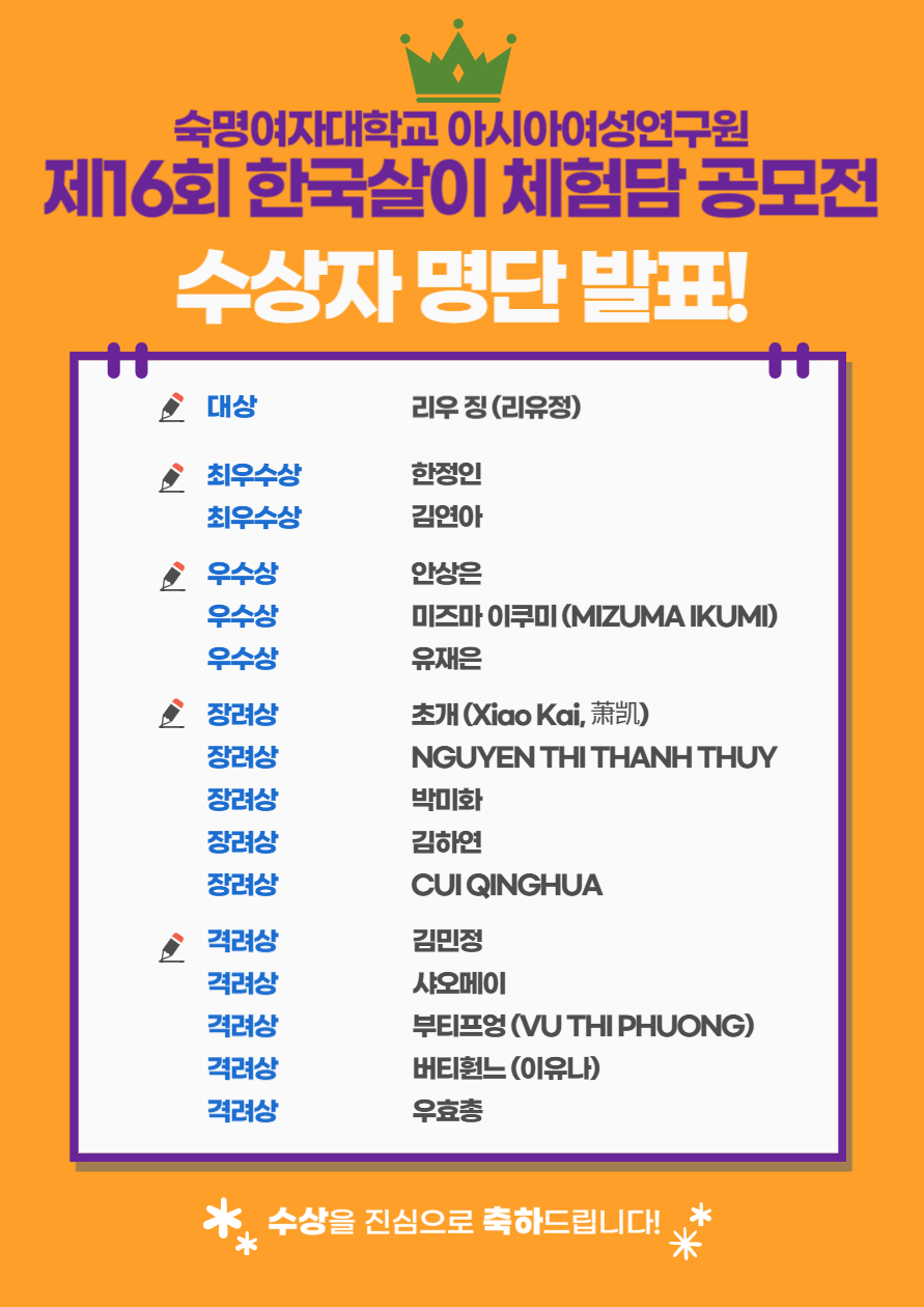 - 2023년12월22일(금) 3시~5시 숙명여자대학교 백주년기념관에서 시상식이 진행됩니다.