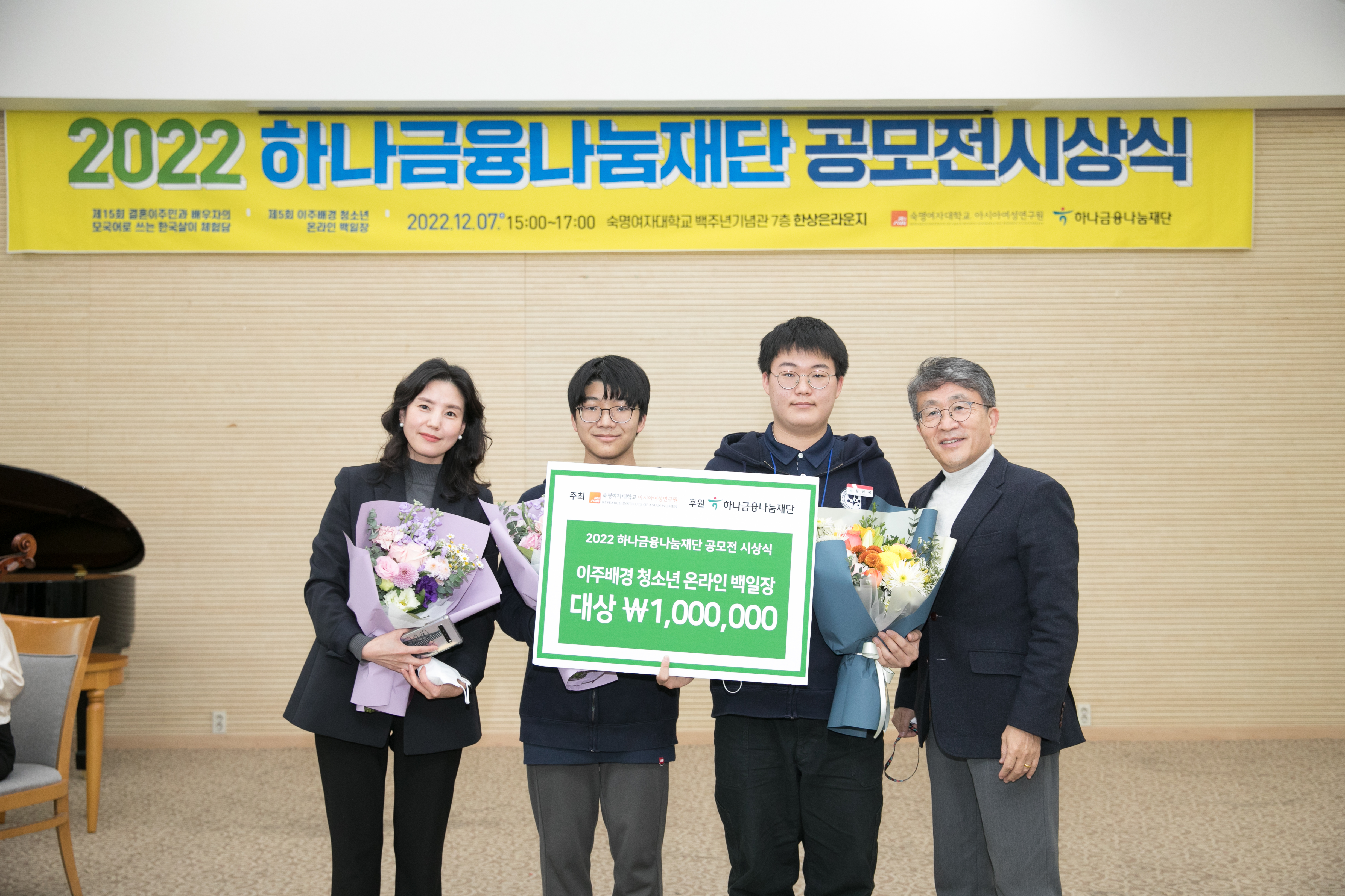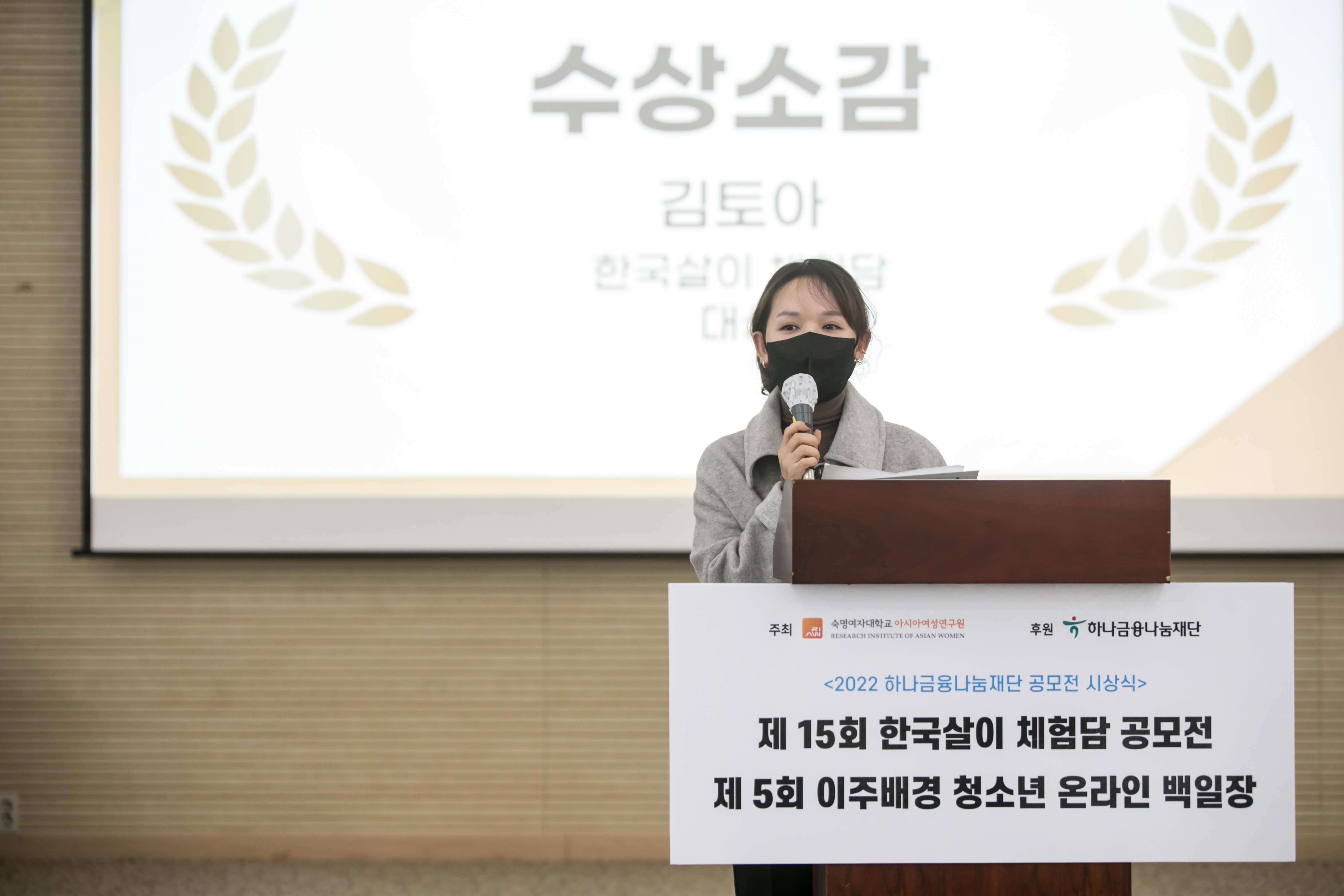 숙명여자대학교 아시아여성연구원은 12월 7일(수) ‘제15회 결혼이주민과 배우자의 모국어로 쓰는 한국살이 체험담’, ‘제5회 이주배경 청소년 온라인 백일장’ 공모전 시상식을 개최했다. 본 행사는 숙명여자대학교 백주년기념관 한상은라운지에서 오후 3시부터 약 두 시간 동안 진행됐으며 대상을 비롯한 최우수상, 우수상, 장려상, 격려상 등 총 27명의 수상자들과 함께 했다.