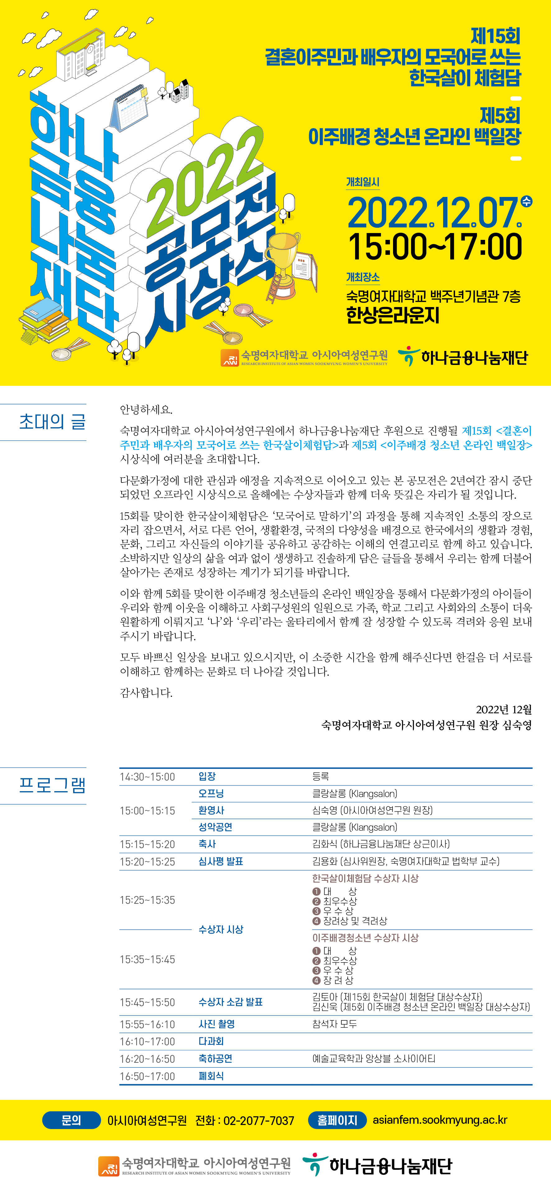 [재공지] 2022년 하나금융나눔재단 후원 제15회 한국살이체험담&이주배경청소년 온라인백일장 시상식