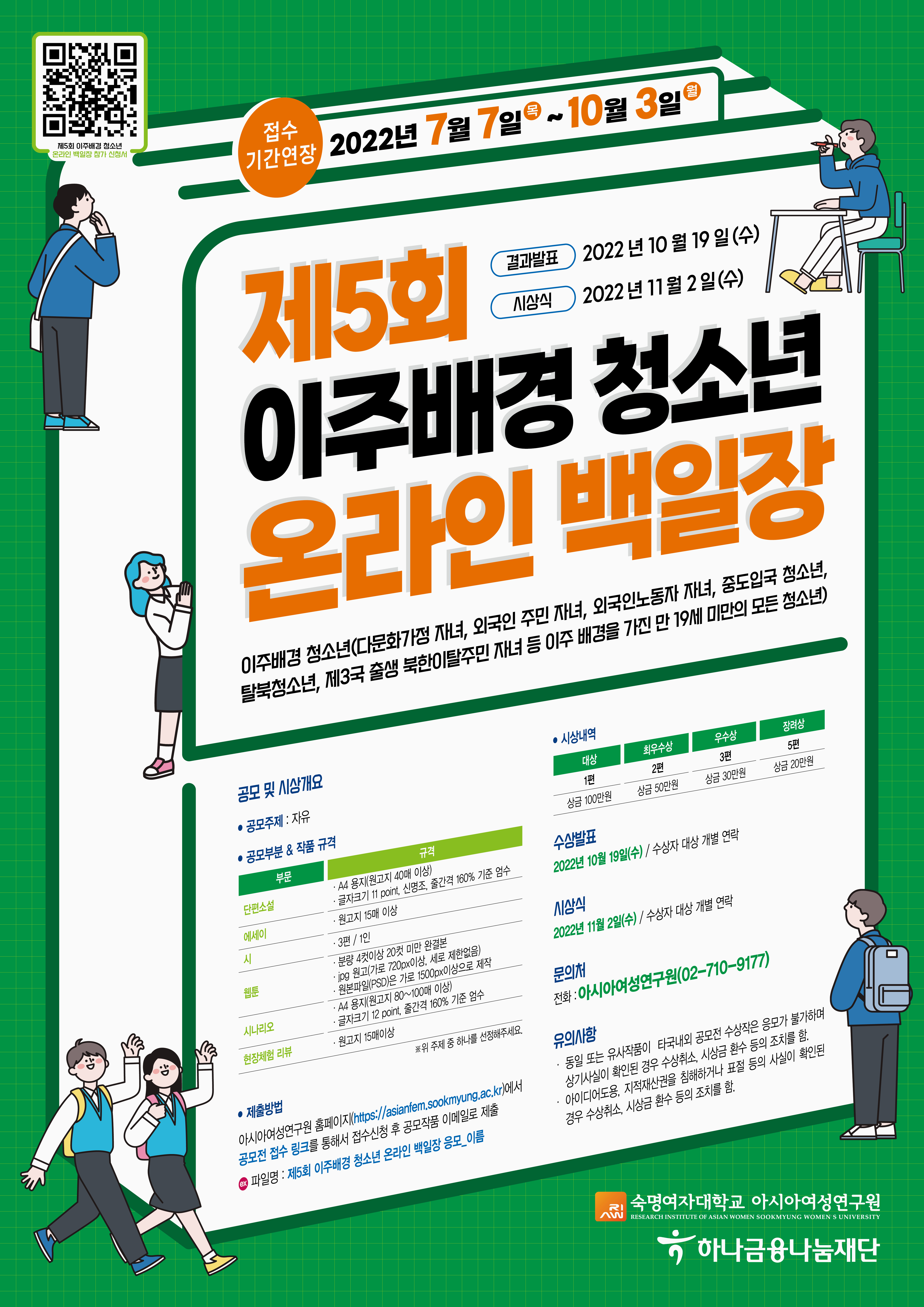 제 5회 이주배경 청소년 온라인 백일장은 이주배경의 청소년들의 목소리를 듣고 이해하며, 고정관념에서 벗어나 청소년 본인의 이야기로 소통의 장을 마련하고자 합니다.