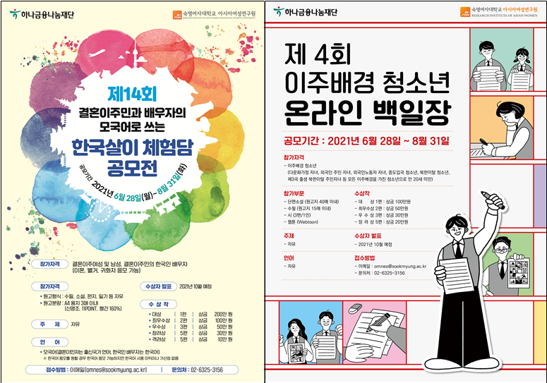 '2021년 제14회 결혼이주민과 배우자의 모국어로 쓰는 한국살이 체험담 공모전', '2021년 제4회 이주배경 청소년 온라인 백일장'에서 위와 같이 수상하셨습니다. 수상하신 분들 진심으로 축하드리며,