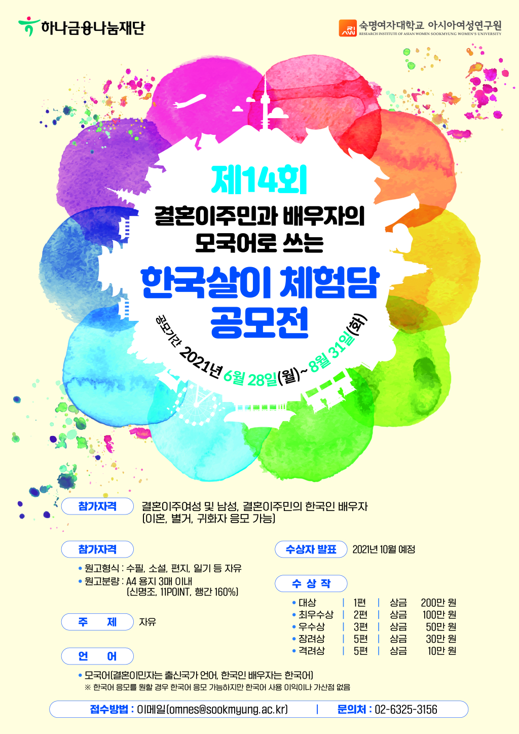 아시아여성연구원에서 <제14회 결혼이주민과 배우자의 모국어로 쓰는 한국살이 체험담 공모전>을