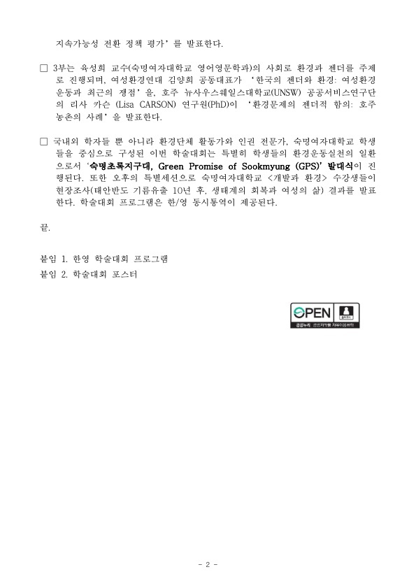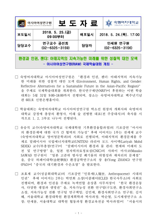 [보도자료] [국제학술대회] 환경과 인권, 젠더: 아태지역의 지속가능한 미래를 위한 성찰적 대안 모색 (Environment, Human Rights, and Gender: Reflective Alternatives for a Sustainable Future in the Asian-Pacific Region)