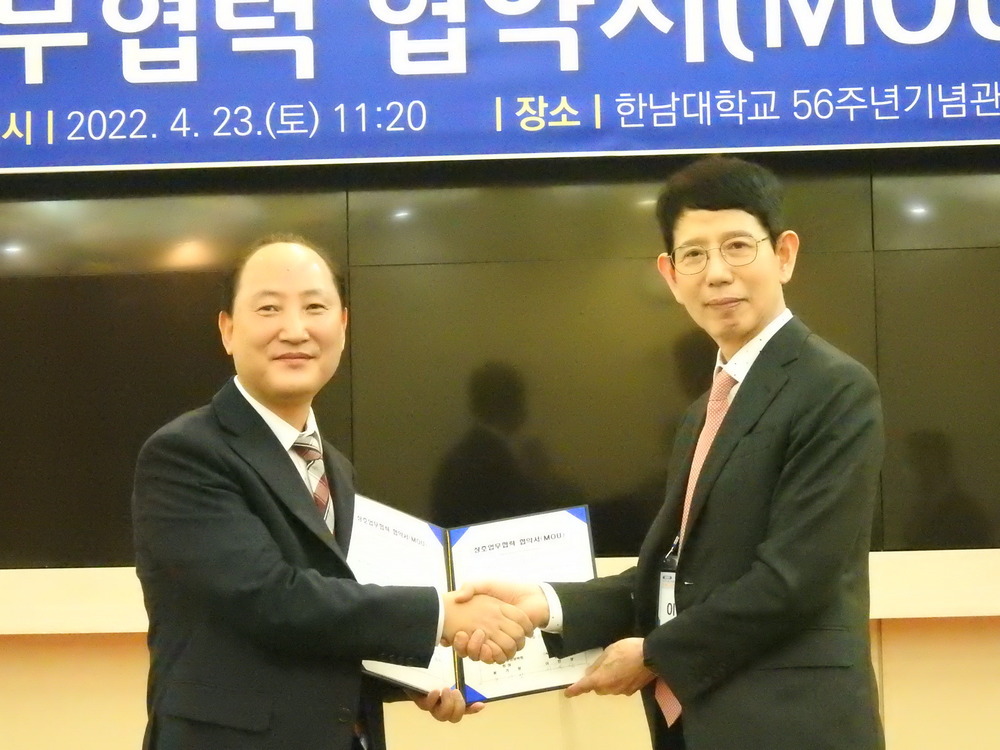 ()한국유통경영학회 윤기창(군산대 교수)회장과 미래정책개발원 이민상 원장이 지난 23일 한남대학교에서 학술발표회를 겸한 상호 협력 MOU(양해각서)를 체결했다.