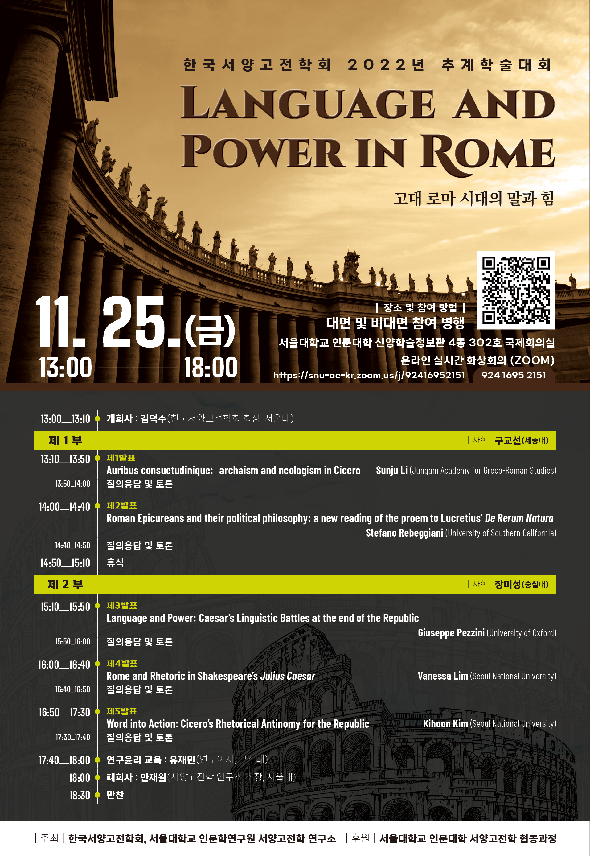 서울대학교 인문대학(4동 302호 국제회의실)에서 대면/비대면 병행으로 진행될 이번 학술대회에서는 'Language and Power in Rome'이라는 대주제 하에 다섯 분의 국내외 연구자들께서 발표를 맡아 주셨습니다. 학기 중이라 바쁘시겠지만, 회원 여러분의 많은 관심과 참여 바랍니다. 세부 일정과 주제에 대해서는 상기 홍보물이나 첨부 파일을 통해 확인해 주십시오.