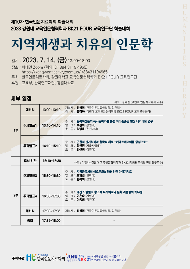 주최: 한국인문치료학회, 강원대학교 교육인문협력학과 BK21 FOUR 교육연구단