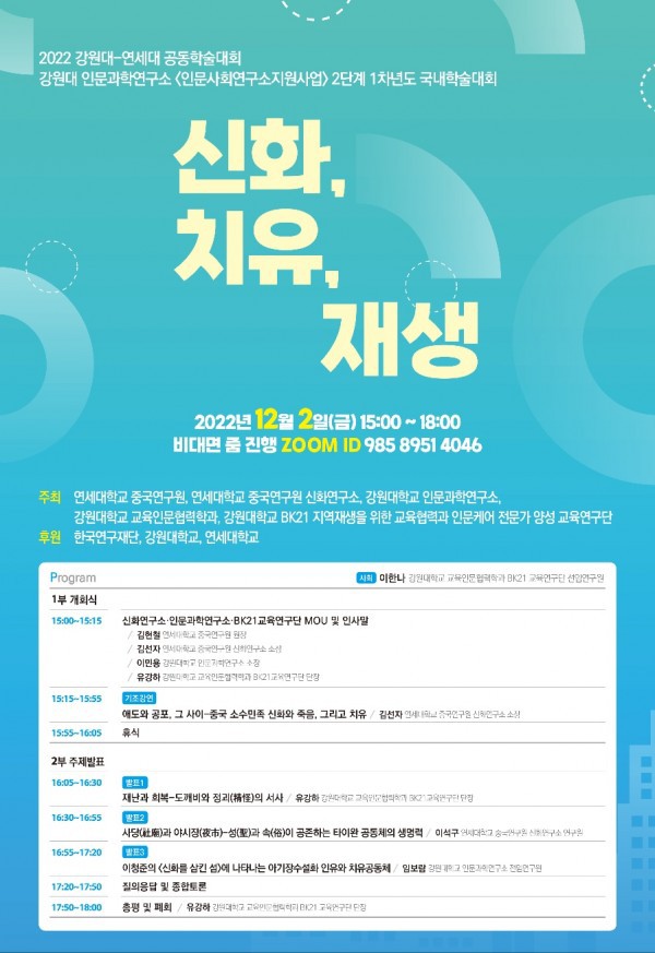 주최: 연세대학교 중국연구원, 연세대학교 중국연구원 신화연구소, 강원대학교 인문과학연구소, 강원대학교 교육인문협력학과, 강원대학교 BK21 지역재생을 위한 교육협력과 인문케어 전문가 양성 교육연구단
