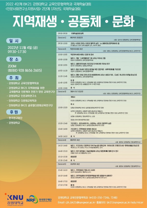 주최(Host) : 강원대학교 교육인문협력학과, 강원대학교 BK21 지역재생을 위한 교육협력과 인문케어 전문과양성 교육연구단, 강원대학교 인문과학연구소, 인하대학교 다문화교육학과, 인하대학교 BK21 글로컬다문화교육연구단