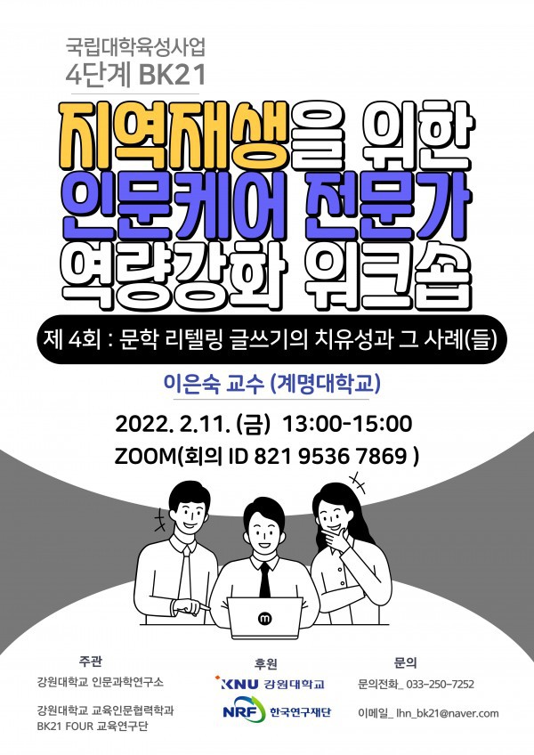 [국립대학육성사업] 4단계 BK21 지역재생을 위한 인문케어 전문가 역량강화 워크숍을 진행합니다.