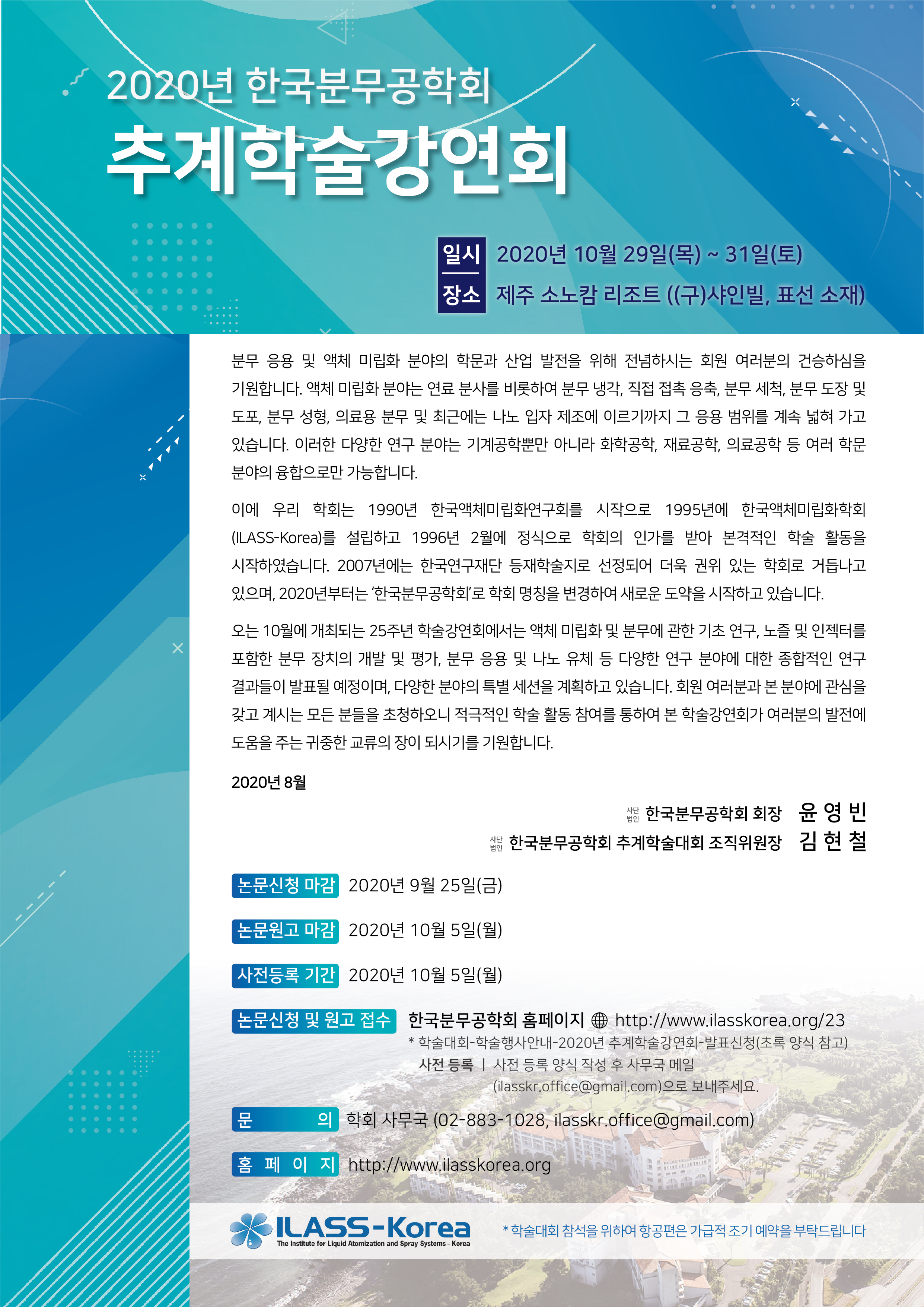 [한국분무공학회] 2020년 추계학술강연회 개최 안내 : 10/29(목)~31(토), 제주 소노캄 리조트