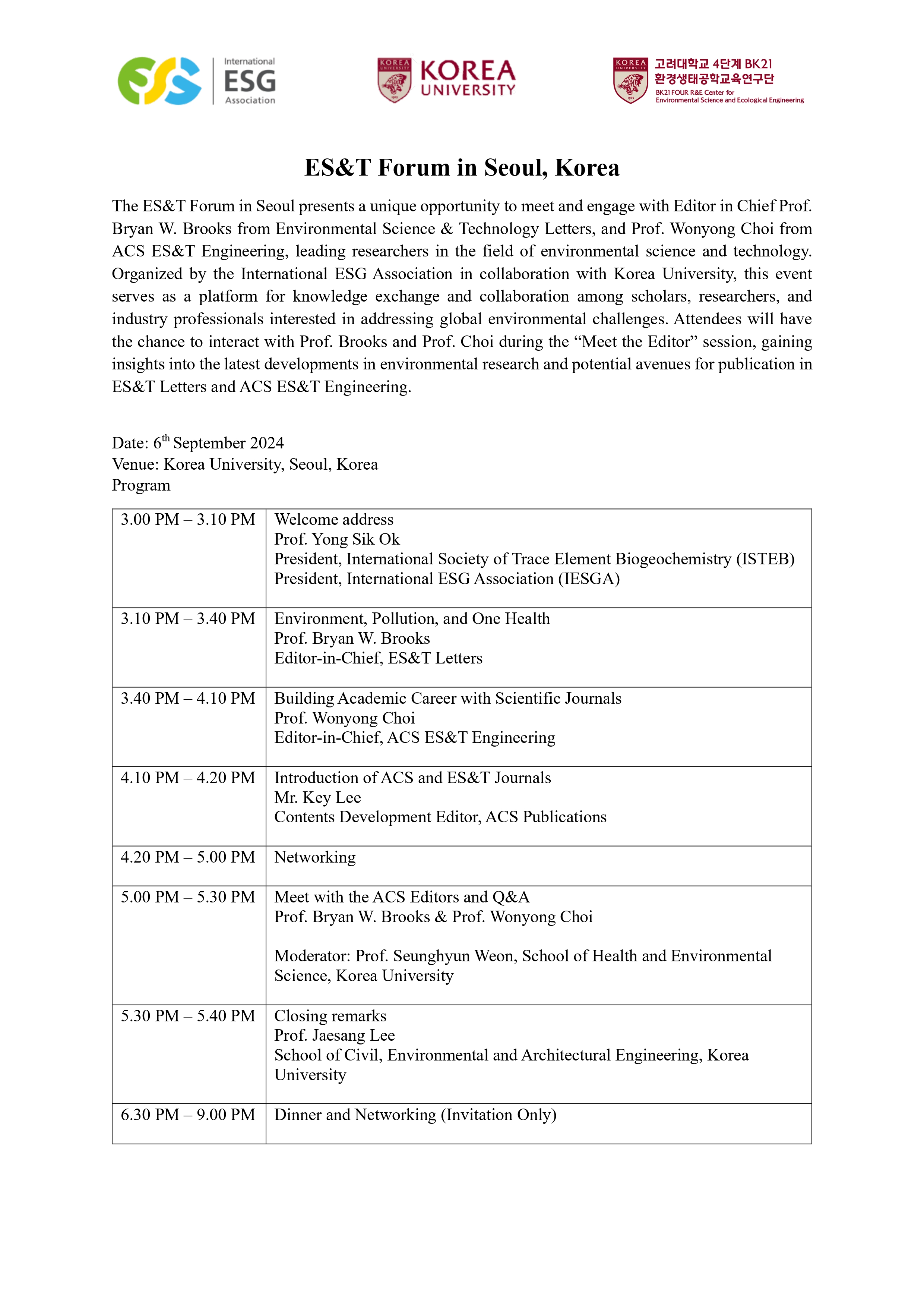 아래와 같이 9월 6일(금) 오후 3시 고려대학교에서 ES&T Forum in Seoul이 개최될 예정입니다. 관심있는 분들의 참가신청바랍니다.