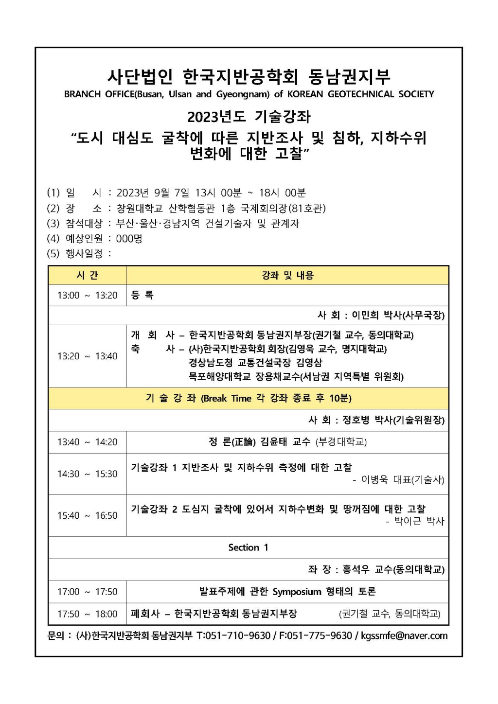 [한국지반공학회 동남권지부] 2023년도 기술강좌 개최 (23.09.07.(목))