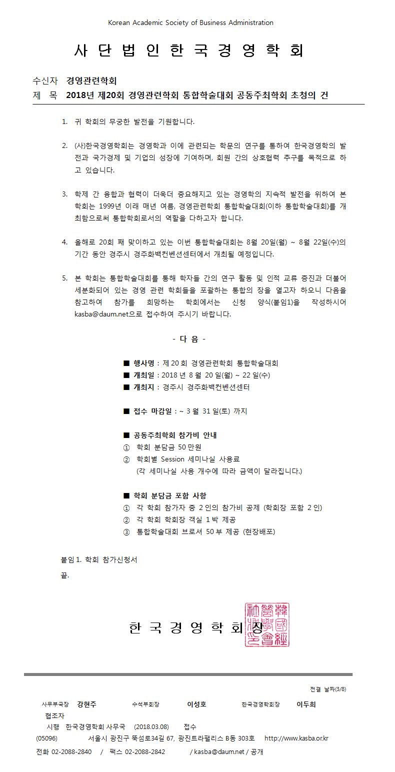 한구경영학회는 올해 제20회 경영관련학회 통합학술대회를 8월 20일(월) ~ 8월 22일(수)의 기간 동안 경주시 경주화백컨벤션센터에서 개최할 예정입니다. 이에 통합학술대회 참가를 희망하는 경영관련학회에서는 아래 공문을 참고하시고 첨부드린 신청 양식(붙임1)을 작성하시어 kasba@daum.net으로 접수하여 주시기 바랍니다.