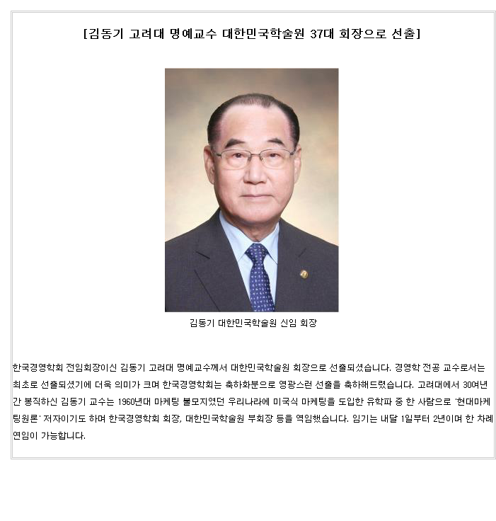 [한국경영학회] 김동기 고려대 명예교수 대한민국학술원 37대 회장으로 선출