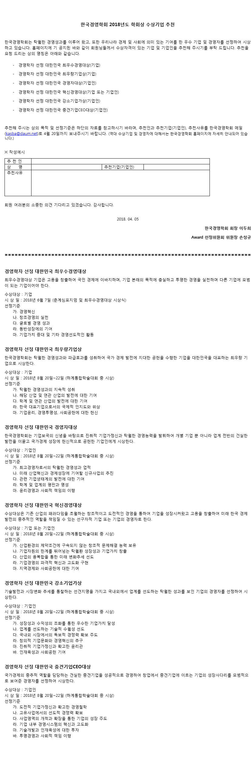 [한국경영학회] 2018년도 학회상 수상기업 추천-회원추천