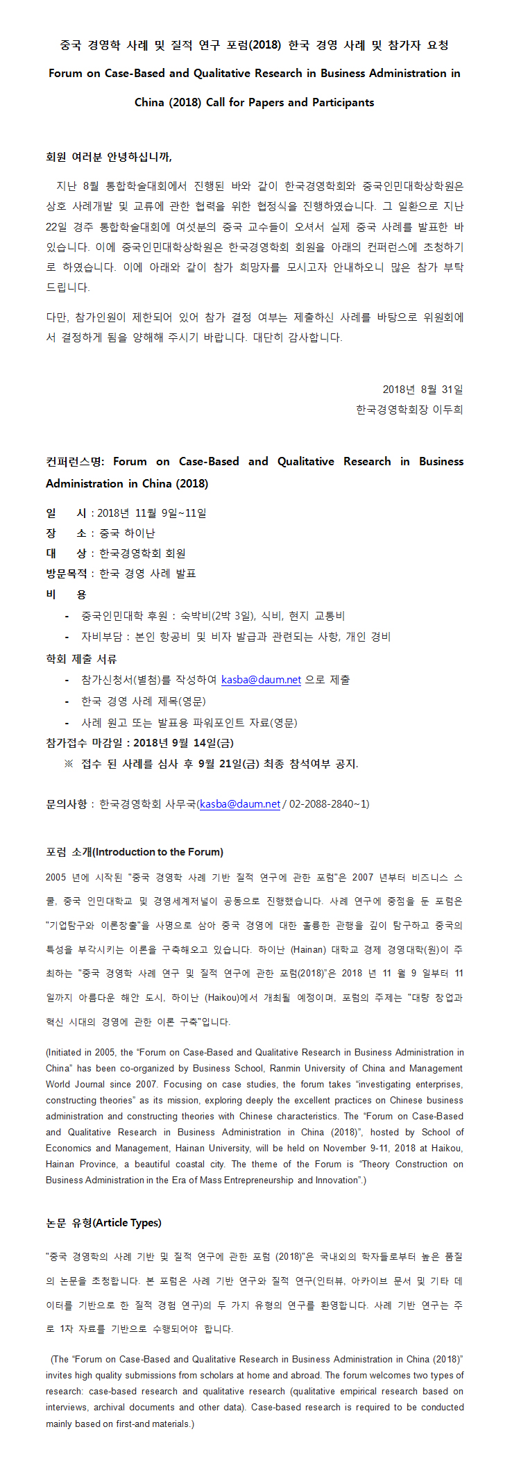[한국경영학회] 중국 경영학 사례 및 질적 연구 포럼(2018) 한국 경영 사례 및 참가자 요청