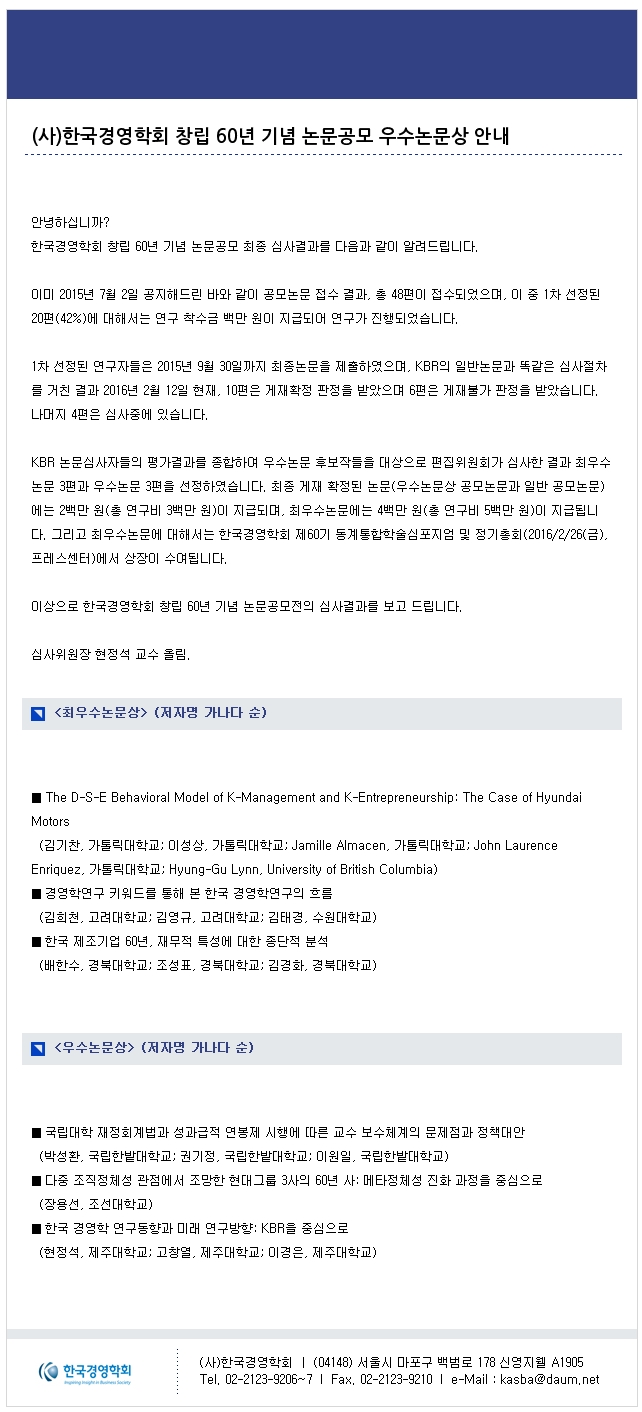 [한국경영학회] 창립 60년 기념 논문공모 우수논문상 안내