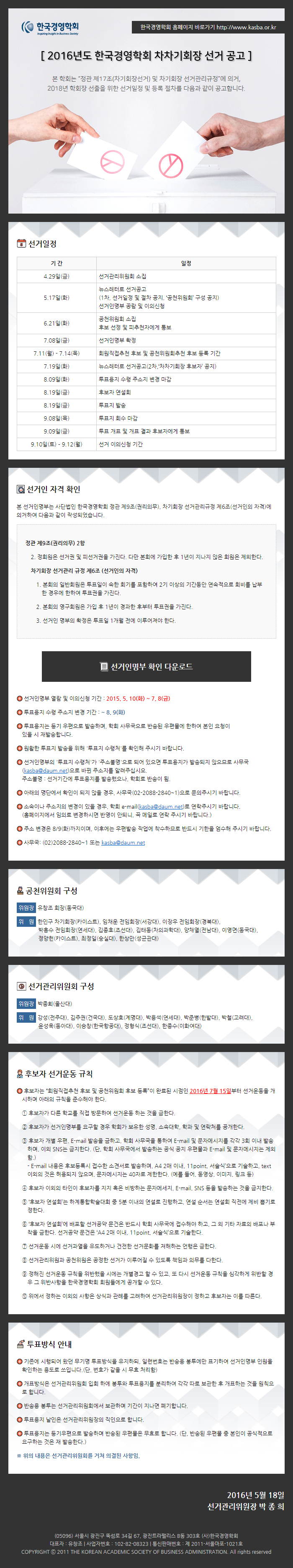 [한국경영학회] 2016년도 차차기회장 선거 공고 (선거인명부 이의신청 기간 ~7/8까지)