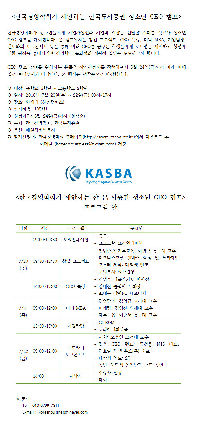 [한국경영학회] 한국투자증권 청소년 CEO 캠프 참가신청 안내
