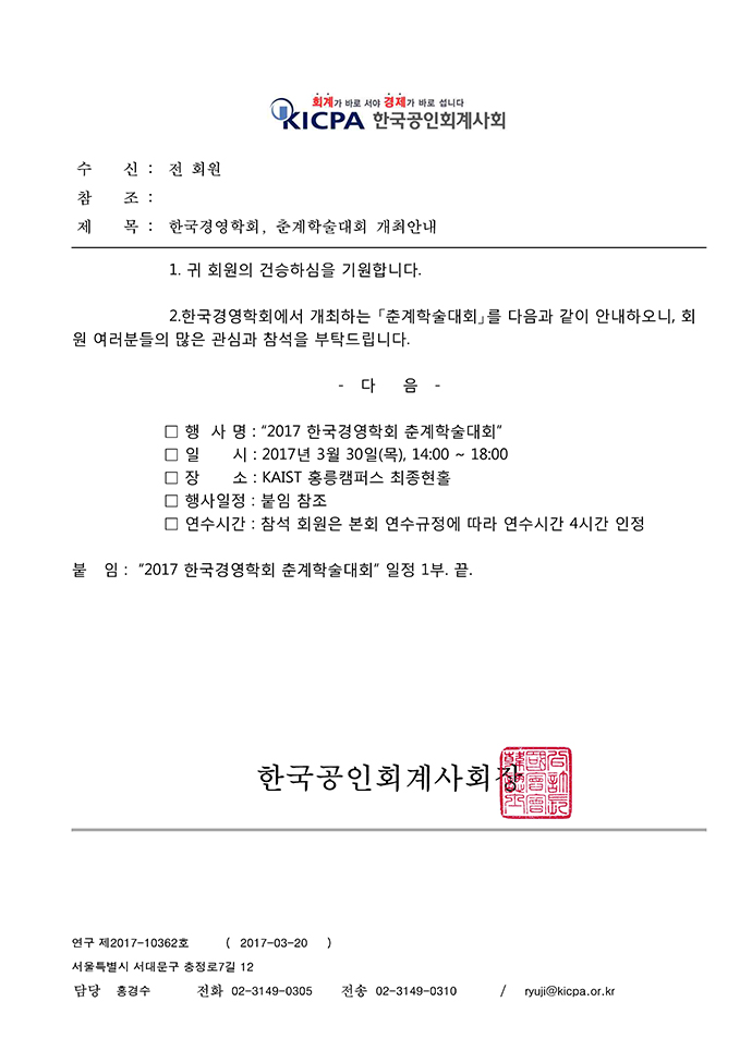 [한국경영학회] 춘계학술대회 한국공인회계사회 안내 내용
